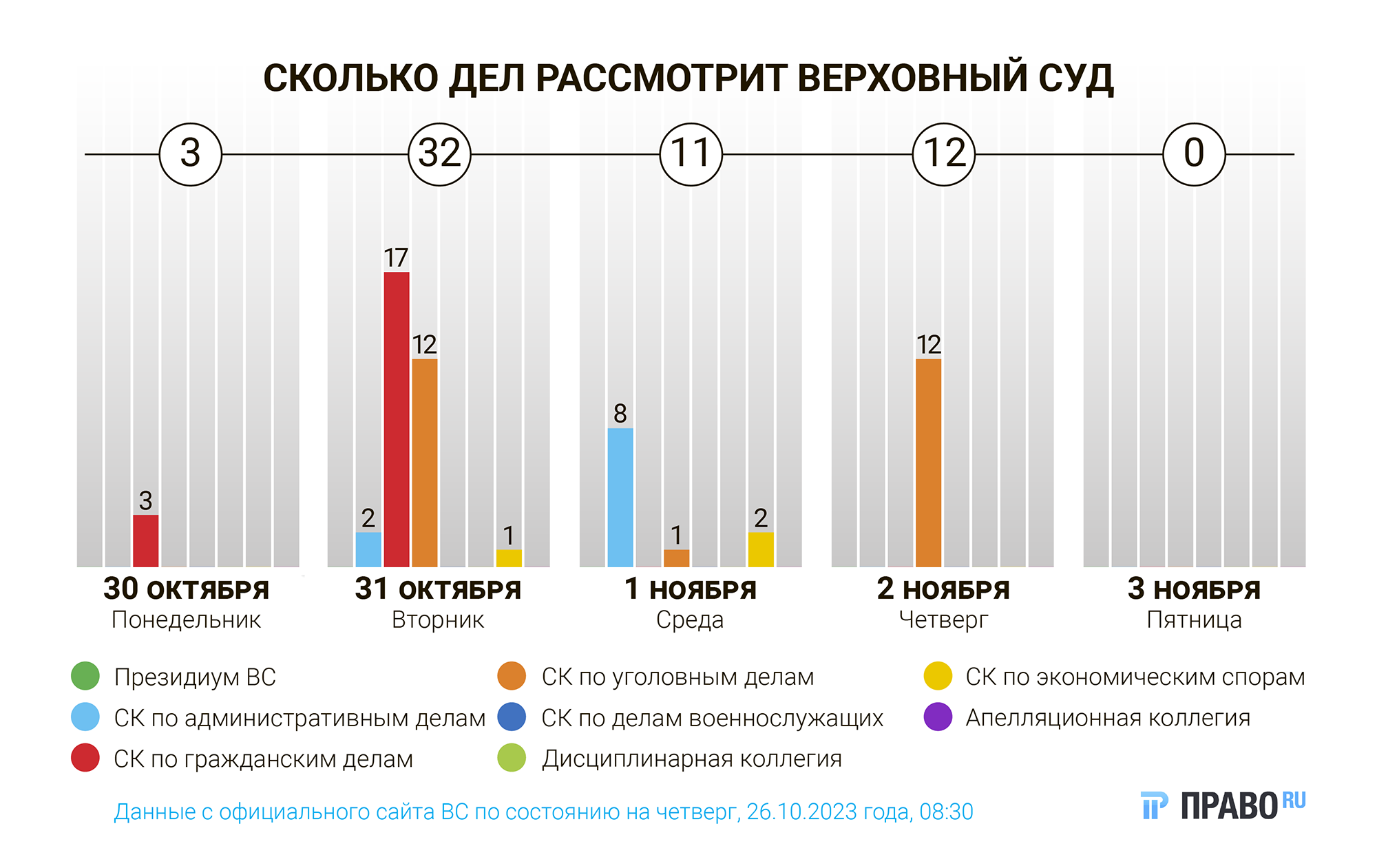 На неделе с 30 октября по 3 ноября Верховный суд рассмотрит более 50 споров. Экономколлегия разберется, может ли арбитражный управляющий ликвидированной фирмы взыскивать дебиторскую задолженность. А в другом споре ВС предстоит решить, мог ли банк менять статус кредитного договора при реорганизации компании. Коллегия по гражданским делам исследует спор покупателя с продавцом. Потребитель сделал онлайн-заказ, который потом аннулировали, так как товара не было в наличии. Еще в одном гражданском деле, дошедшем до ВС, разведенные родители погибшего участника СВО спорят о праве на выплаты членам семей военнослужащих.