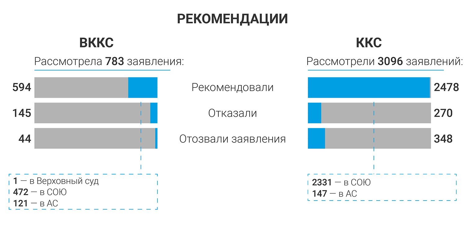 За первые полгода ВККС дала рекомендации почти 76% кандидатов. В этот период судейский орган часто поддерживал региональных коллег: удовлетворили лишь около 18% жалоб на решения местных ККС. Эти данные опубликовали в пятом вестнике ВККС. Еще в издании рассказали о судейских историях. Одной судье выдали предупреждение. Она не платила по кредитам, которые взяла для раздачи долгов азартного супруга. Другого понизили в классе, потому что он угрожал соседу по гаражу. А еще ВККС согласилась с прекращением отставки судьи, потому что он работал юрисконсультом.