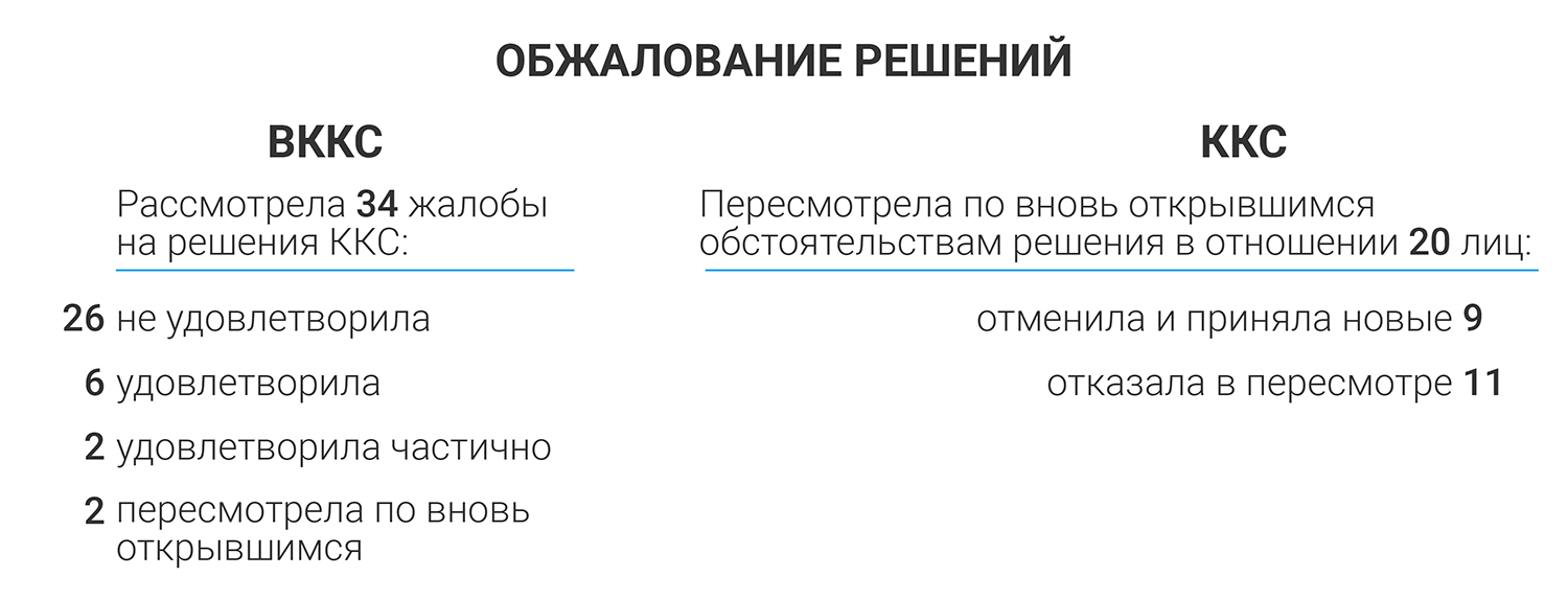 ВККС редко не соглашается с решениями коллег из регионов. Так, в первом полугодии удовлетворили только порядка 18% жалоб на акты местных ККС. Они же, в свою очередь, часто пересматривают ранее принятые решения — 45% (9 из 20 актов).