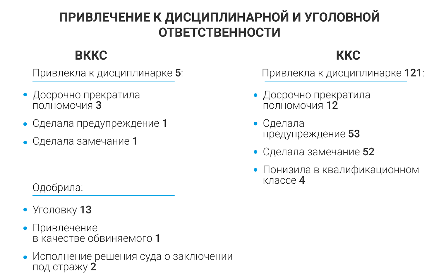 Что касается дисциплинарной ответственности, большинству судей местные ККС сделали предупреждение. Такой исход был в 44% случаев (53 из 121 решения). ВККС же выдала лишь одно предупреждение.