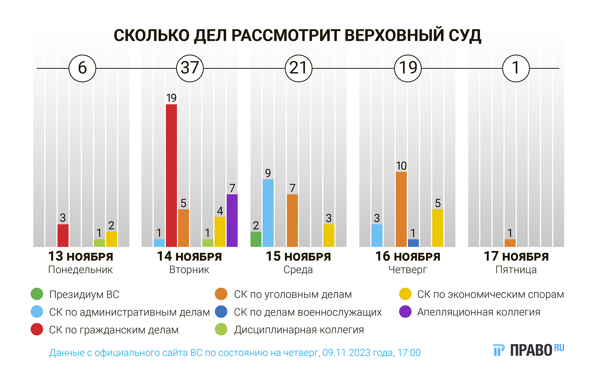 Семь заседаний пройдет в апелляционной коллегии, большинство из которых неявочные. Админколлегия проведет в два раза больше процессов. В основном заявители оспаривают положения тех или иных нормативных актов разных уровней.