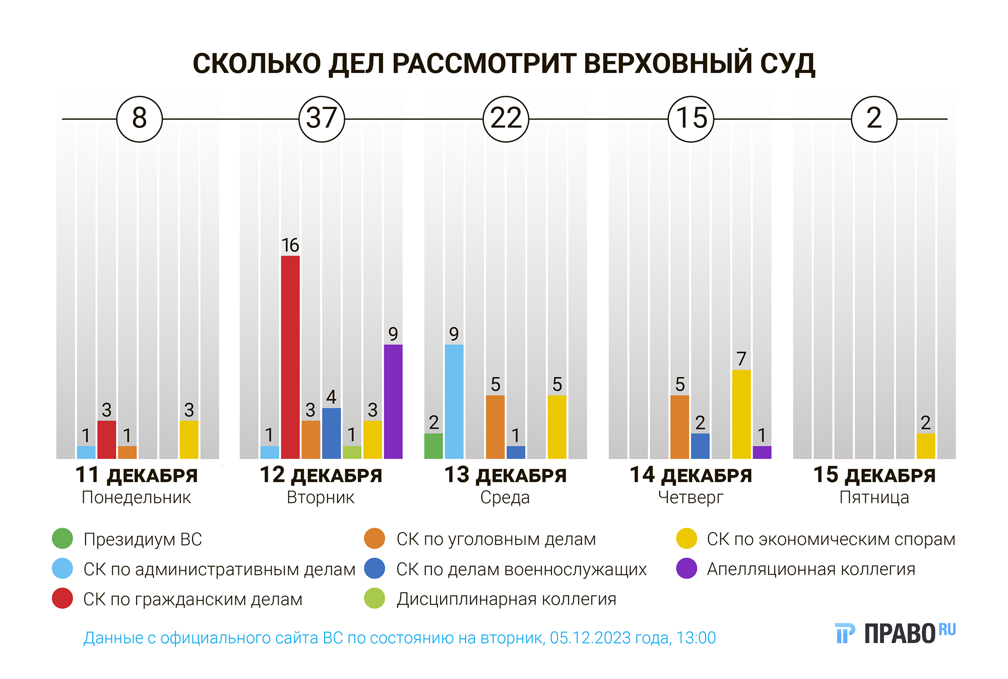 Еще семь уголовных дел рассмотрит коллегия по делам военнослужащих, два — Президиум ВС. Дисциплинарная коллегия на этой неделе не соберется.
