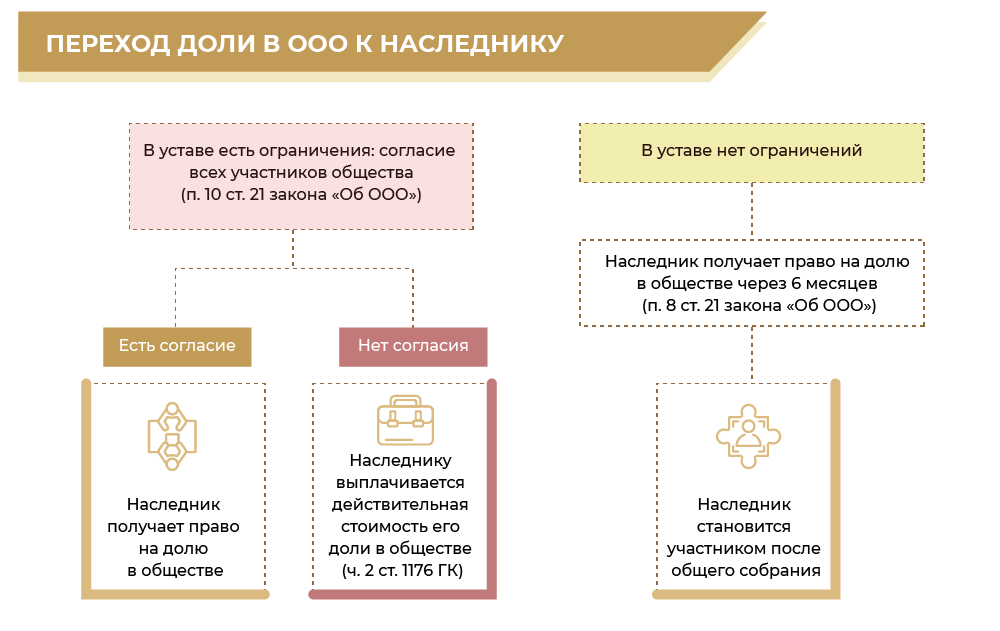 - Если в уставе есть условие, что для вхождения в состав общества нужно согласие, то приобретение доли супругом или наследником не наделяет их статусом участника. Его можно получить, если это одобрят остальные члены компании. Если согласия нет, супруг или наследник требуют выплату действительной стоимости доли.