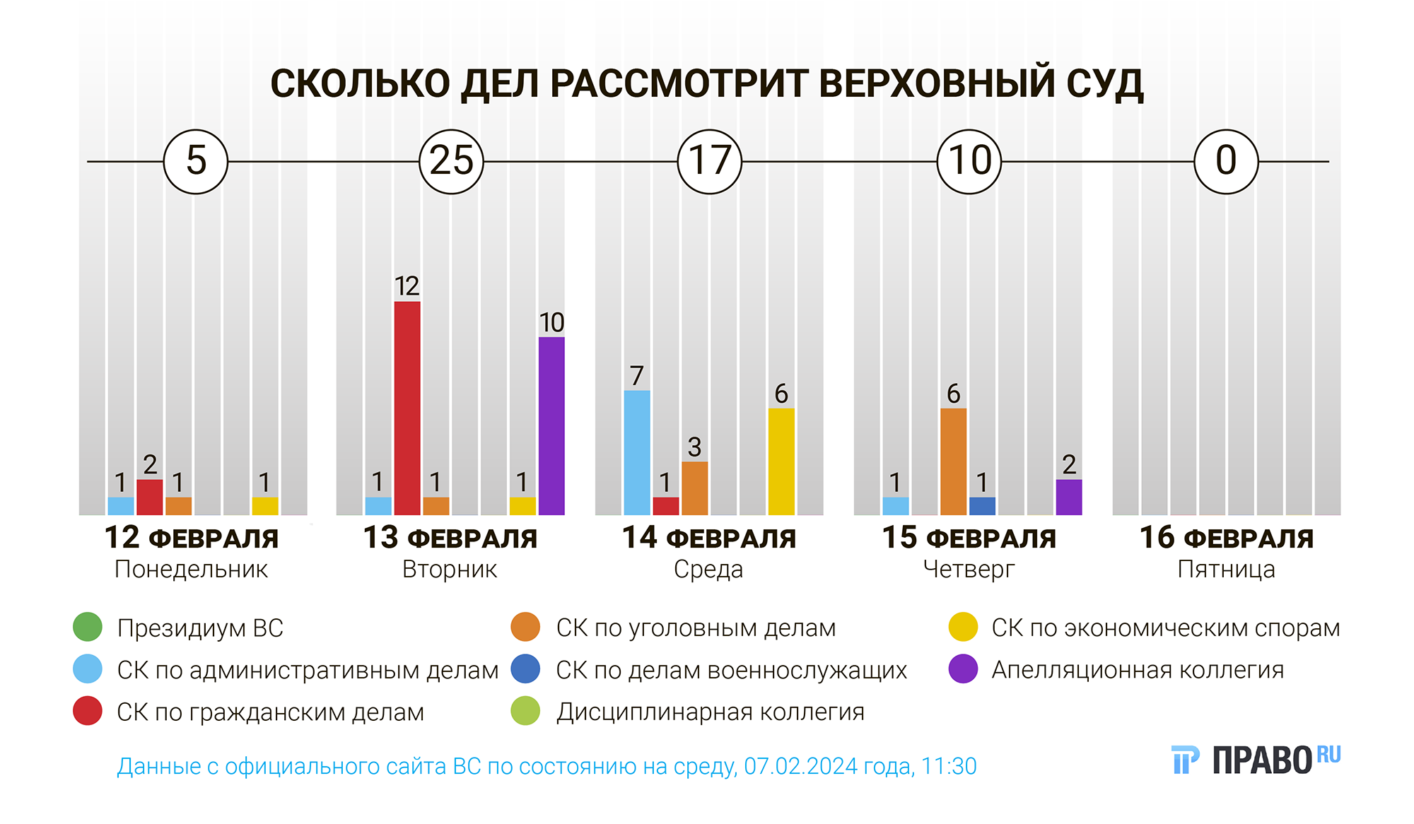 Президиум на этой неделе не собирается. В апелляционной коллегии двенадцать споров, в уголовной — одиннадцать, в коллегии по административным делам — десять, а в коллегии по делам военнослужащих — одно.