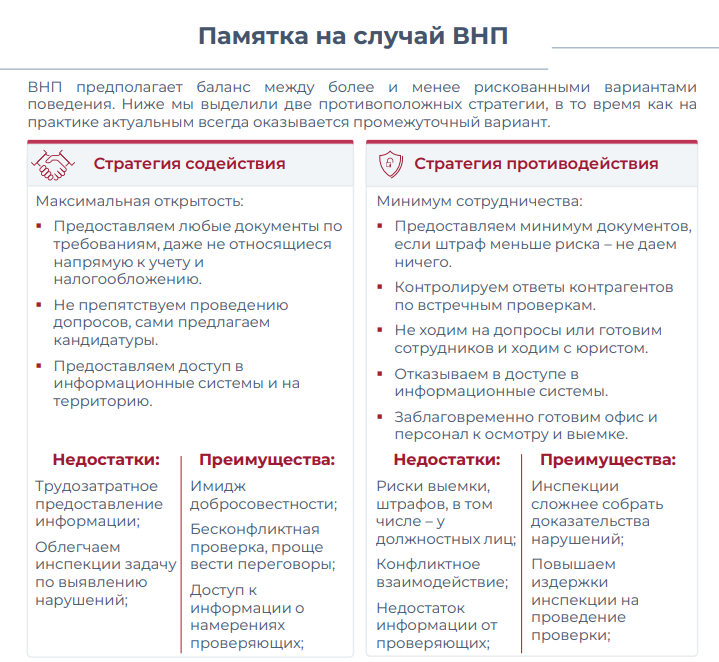 В конце интерактива эксперты поделились чек-листом, который описывает стратегии поведения для руководителей и работников компаний на случай выездной налоговой проверки. «В идеале за каждым нашим поступком должна стоять стратегия», — подытожил Лысенко.