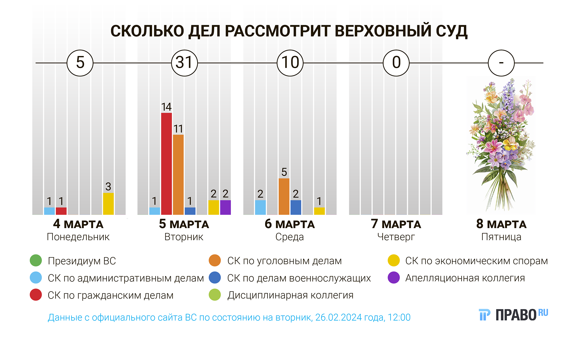 В коллегии по уголовным делам 16 дел, в коллегии по административным делам — четыре, в коллегии по делам военнослужащих — три. В апелляционной коллегии два спора, а Президиум и дисциплинарная коллегия на этой неделе не собираются.