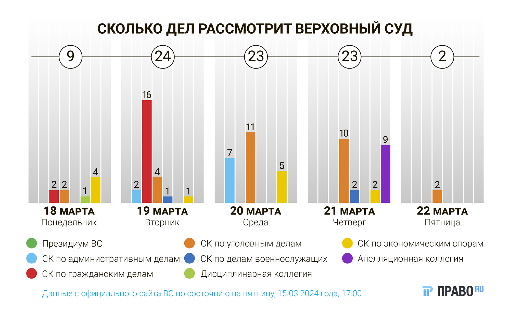 Президиум ВС на этой неделе не будет собираться, а в административной коллегии назначено девять заседаний. Большинство из них касаются оспаривания нормативных актов разного уровня. Столько же дел разберет и апелляционная коллегия. Одно из них судейское. Осенью прошлого года ВККС дала согласие на возбуждение уголовного дела в отношении мирового судьи 1-го судебного участка Венгеровского судебного района Новосибирской области в отставке Марины Сальниковой. Следователи считают, что судья вступила в сговор с представителем подсудимого. Она якобы договорилась о получении 3 млн руб. в качестве взятки и обещала прекратить уголовное преследование с назначением судебного штрафа. Изначально подсудимый согласился на «сделку», но потом обратился к правоохранителям. Поэтому юриста задержали при получении денег. Далее он передавал сумму Сальниковой под наблюдением силовиков. Такие действия следователи квалифицировали по ч. 6 ст. 290 УК («Получение взятки»). Подробнее об этой истории мы писали в новости «ВККС одобрила уголовку для отставного судьи из-за взятки». В админколлегии ВС бывшей судье не удалось оспорить решение Высшей квалифколлегии.