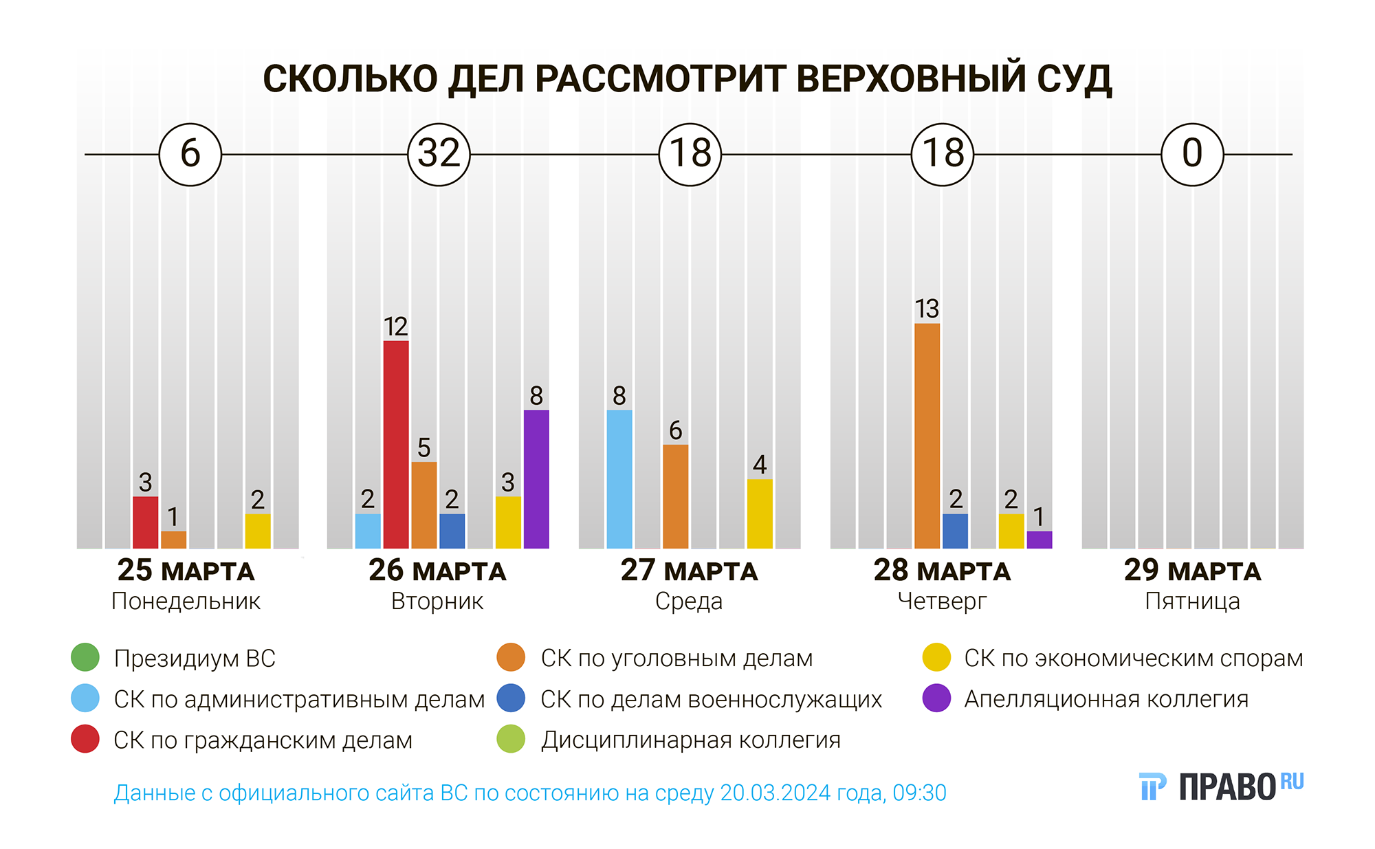 В последнюю неделю марта ВС рассмотрит 75 дел. Экономколлегия разберет спор о том, кто должен платить налог на добавленную стоимость, который контрагенту по сублицензионному договору пришлось уплатить в бюджет из-за вступивших в силу изменений Налогового кодекса. Коллегия по уголовным делам рассмотрит жалобы фигурантов дел о реабилитации нацизма, апелляционная — жалобу судьи, которого лишили мантии 25 лет назад.