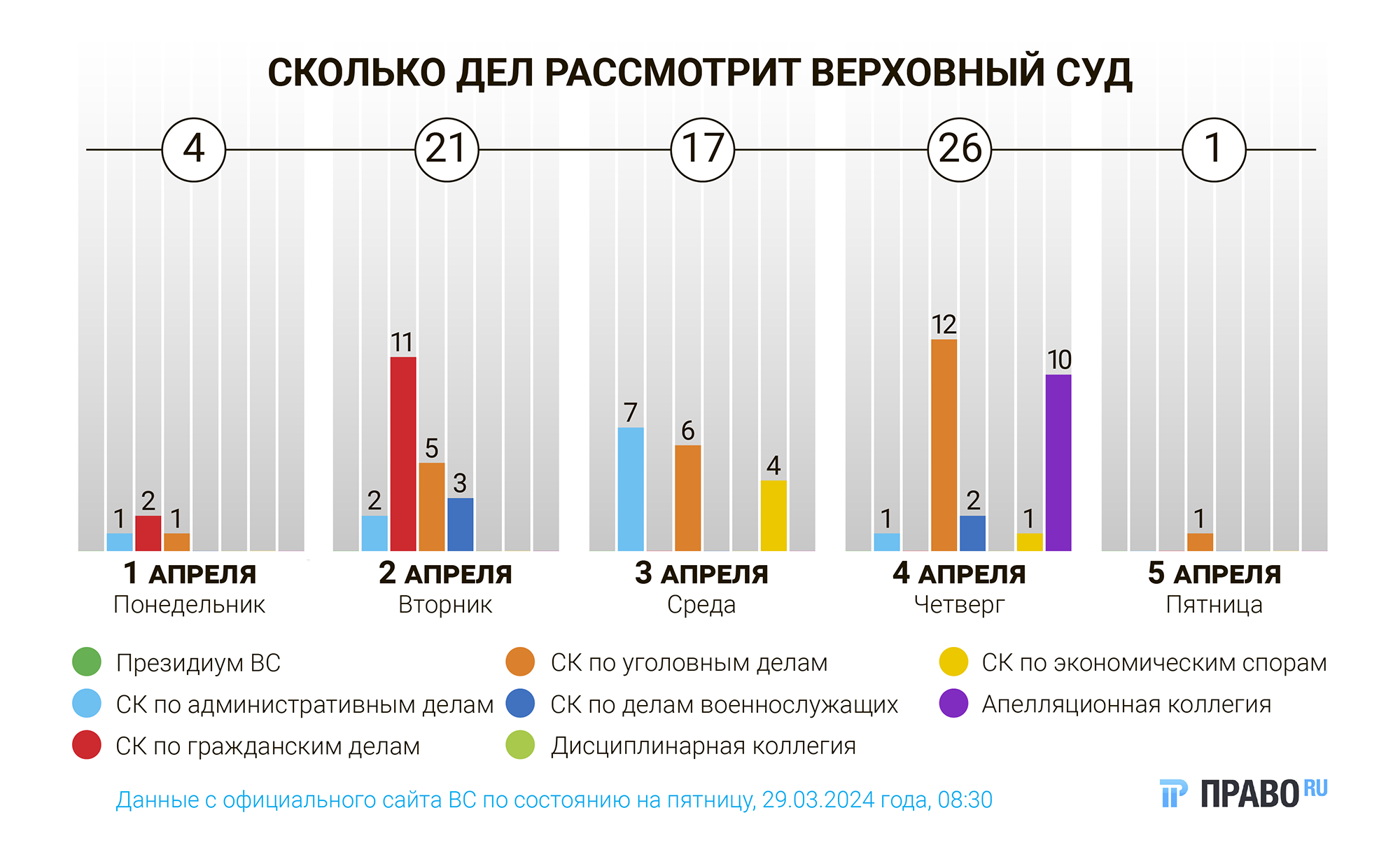 В первую неделю апреля Верховный суд рассмотрит 69 жалоб. Экономколлегия разберется, может ли таможня арестовывать имущество, если суд уже принял обеспечительные меры. В другом разбирательстве пристав не стал переводить деньги из-за подозрительной доверенности заявителя. Гражданская коллегия рассмотрит два иска к онлайн-магазинам, в которых потребители купили товар по низкой цене из-за технического сбоя. В уголовной коллегии есть жалобы экс-судьи и обвиненного в госизмене журналиста Владимира Кара-Мурзы*, а в апелляционной — Алексея Навального и бывшего депутата.
