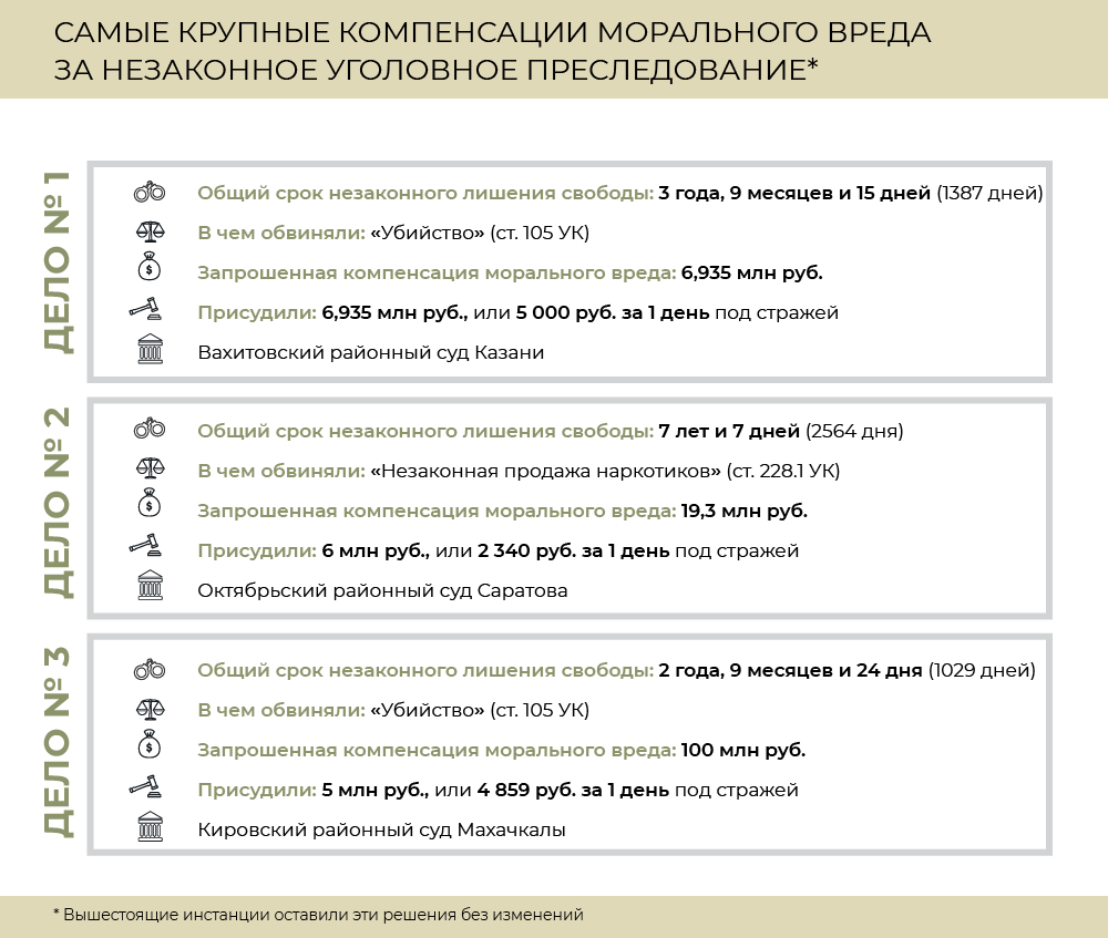 Нижестоящие инстанции порой пытаются присудить бóльшие суммы, но апелляции их существенно снижают. Так произошло в деле Фатхуллы Исхакова, который более полувека добивался оправдания. За убийство, которое не совершал, он отсидел в советской колонии 13 лет. Ленинский райсуд Уфы присудил пенсионеру 31,65 млн руб. компенсации морального вреда. Тот изначально просил взыскать 450 млн руб. «Почти 50 лет после освобождения ушло на поиск правды. В СССР после освобождения Исхаков был изгоем, пораженным во многих правах. Поэтому присужденная сумма — мизерная», — комментировал решение его защитник, юрист Виталий Буркин. В дальнейшем ВС Башкортостана уменьшил компенсацию до 2 млн руб. (дело № 3-23013/2023). Сейчас этот спор разбирает кассация.