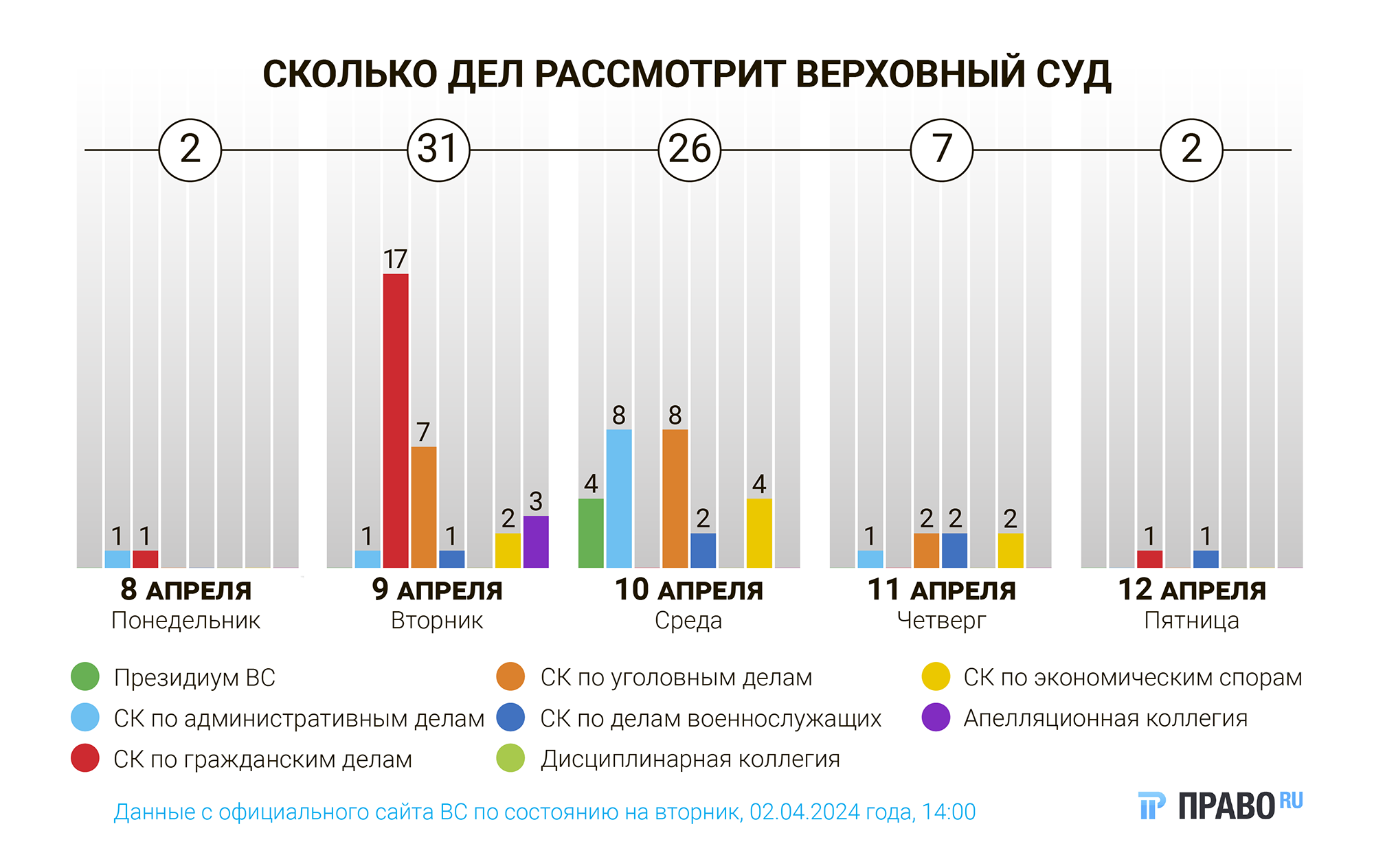 Два из 11 исков, которые рассмотрит админколлегия, тоже поданы судьями. Судья 35-го гарнизонного военного суда Роман Дедов в отставке оспаривает решение ВККС, которая в ноябре 2023-го дала зеленый свет на возбуждение в отношении него уголовного дела за повторный отказ от медосвидетельствования (№ АКПИ24-146). Бывший судья АС Волгоградской области Дмитрий Поляков, который ушел в отставку в 2015 году, оспаривает январское решение областной ККС о прекращении его отставки и лишении льгот (№ АКПИ24-195).
