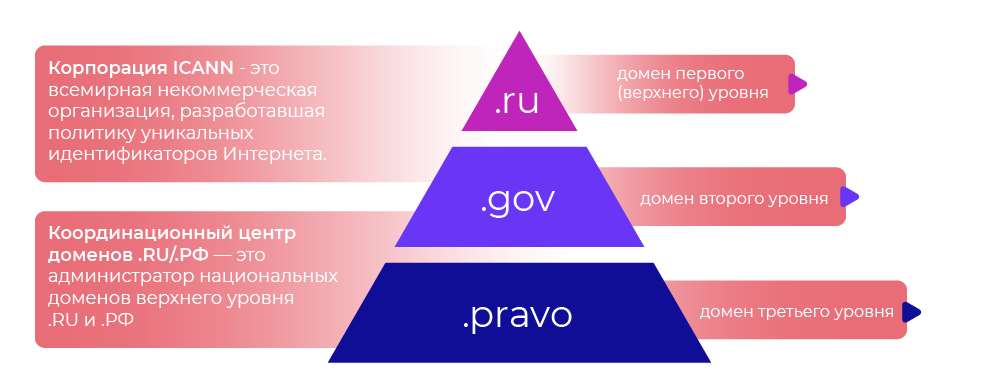 Доменное имя состоит из нескольких уровней. Так, в pravo.gov.ru часть ru — это домен верхнего уровня; gov — второго; pravo — третьего. Чтобы получить право администрировать четвертый домен, нужно заключить договор оказания услуг с администратором предыдущего домена (в примере — третьего). Вся эта пирамида сводится к международной организации ICANN, которая и разработала систему регистрации доменов. ICANN аккредитует регистраторов таких доменов, как, например, .com, .net и других.