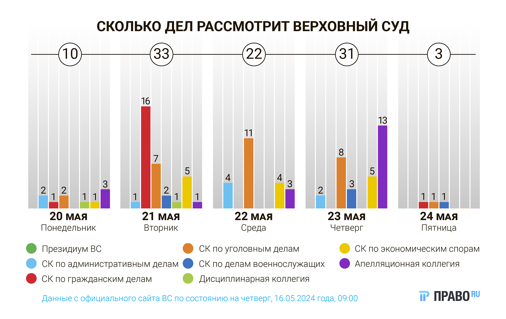 Пять уголовных дел рассмотрит коллегия по делам военнослужащих (все по «террористической» 205-й статье УК), еще 29 — коллегия по уголовным делам. В основном это жалобы на приговоры за насильственные преступления. Президиум ВС на этой неделе собираться не будет.