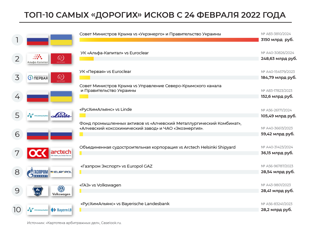 Более интересные и публичные споры расположились на втором и третьем местах нашего рейтинга соответственно: это иски УК «Альфа-капитал» на 248,6 млрд руб. (№ А40-30826/2024) и УК «Первая» на 184,8 млрд руб. (№ А40-154579/2023). Ответчиком в обоих делах выступает бельгийский Euroclear Bank. Суммы исков составляют убытки в размере стоимости заблокированных европейским депозитарием ценных бумаг, накопленный доход и проценты на эти суммы. По состоянию на конец мая оба крупных иска еще не рассмотрены, кроме того, оба значительно «похудели»: УК «Первая» еще несколько месяцев назад уменьшила сумму требований до 102 млрд руб., а часть требования «Альфа-капитал» на 236 млрд руб. выделили в отдельное производство. Новое дело пока не зарегистрировано.