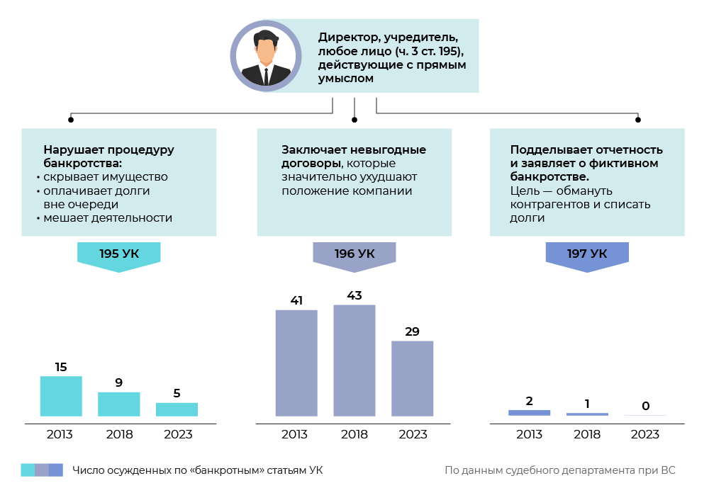 По данным Суддепа при Верховном суде, преднамеренное банкротство — самый распространенный из названных составов. Количество осужденных по этой статье выше, что по двум другим статьям. При этом говорить о массовом применении нормы нельзя, говорит Сергей Гревцов, адвокат, партнер По сравнению с другими нормами, банкротные статьи УК применяют не так часто, и количество дел по ним лишь сокращается. Меньше всего осужденных по ст. 197 УК. В прошлом году по ней не осудили ни одного человека.