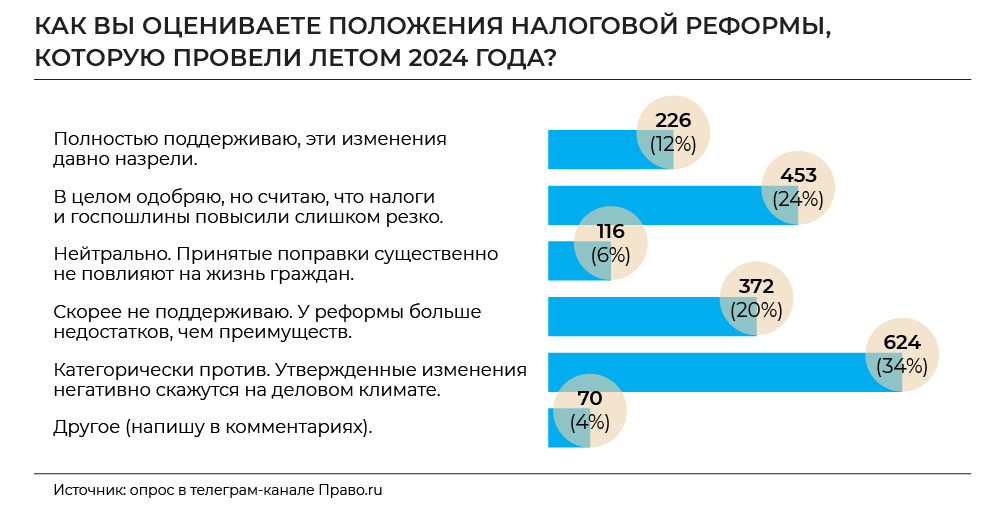 Около четверти в целом поддерживают направление реформы, но не новые ставки налогов и госпошлин. Вопрос судебных пошлин в целом стал самым острым для юристов. Об этом говорят комментарии читателей телеграм-канала. Многие отмечают необоснованность удорожания похода в суд. Только 12% опрошенных полностью поддерживают реформу, а 6% участников опроса относятся к реформе нейтрально.