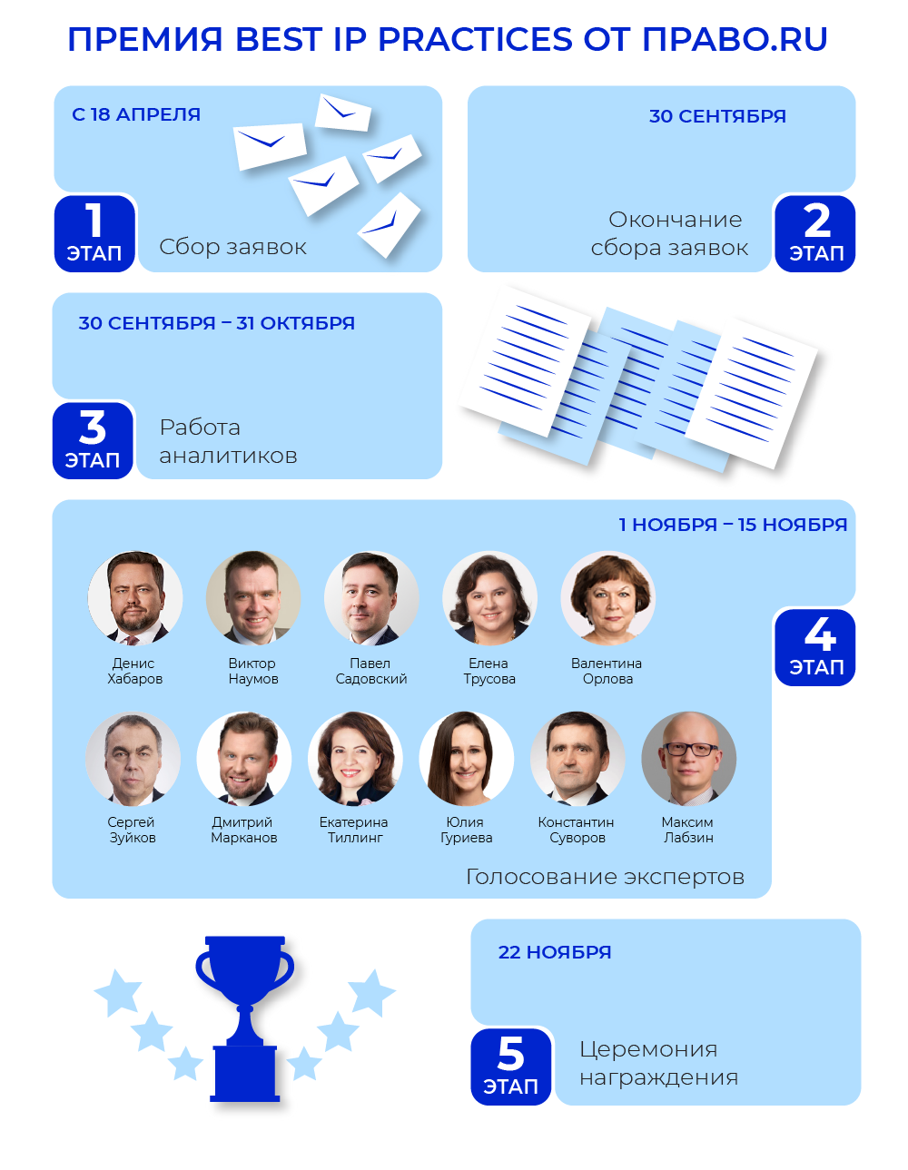 - Лидер IP-команды — отметим главу юридического департамента или IP-отдела за развитие своих сотрудников в сфере IP, организацию и поддержку проектов, направленных на охрану и защиту объектов ИС компании.