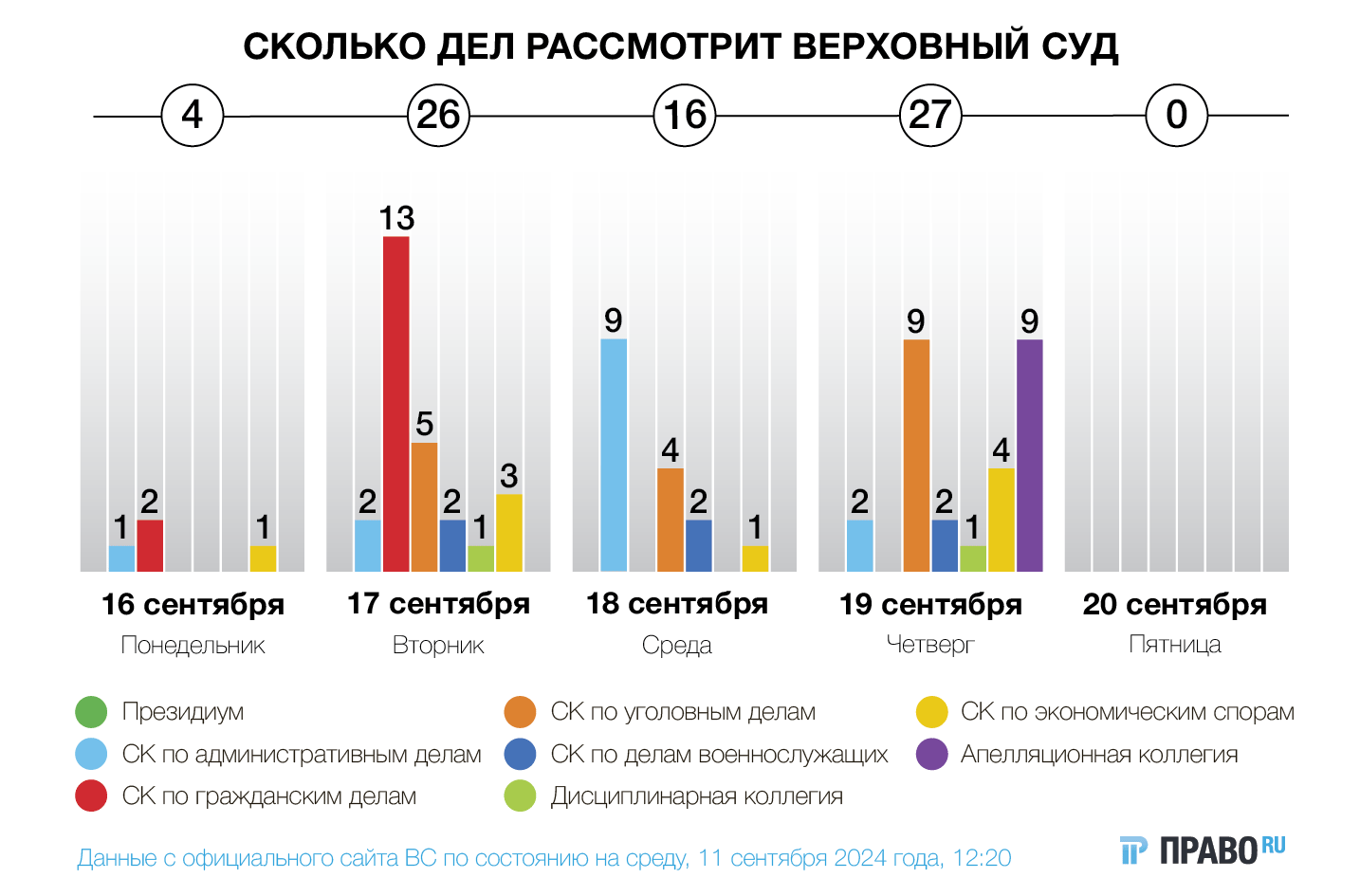 Апелляционная коллегия разберет девять споров, коллегия по делам военнослужащих — шесть. В коллегию по уголовным делам поступило 20 дел. Среди них несколько убийств, госизмена и организация преступного сообщества. Президиум на этой неделе собираться не будет.