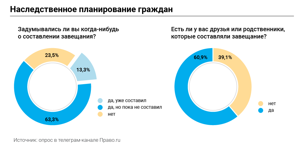 Большинство людей по-прежнему не видят смысла в брачных договорах или медлят с их составлением. Завещания после себя тоже оставляют редко. Проведенное Право.ru исследование показало, что даже наши читатели нечасто прибегают к этим инструментам. Юристы подтверждают: эти темы весьма болезненны для многих россиян. Одни считают, что «наследники сами разберутся, так как умершим уже будет все равно», а другие отталкиваются от суеверий: «Не к добру составлять завещание».