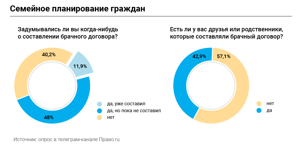 Но к составлению брачного договора россияне прибегают редко. «Брачные договоры в обществе не приняты. Думаю, мой муж очень бы удивился, предложи я такое», — заметила одна из респонденток. Ей 57 лет, и она не слышала, чтобы хоть кто-то из ее знакомых составил такой документ. По наблюдениям, делится партнер «Q&A» Вероника Перфильева, зачастую люди не знают, как начать с супругом разговор о брачном договоре. Все-таки есть страх обидеть, «выказать недоверие», поссориться. Еще, добавила юрист, подобные инструменты не востребованы людьми, у которых нет крупных активов: им кажется, что делить нечего.
