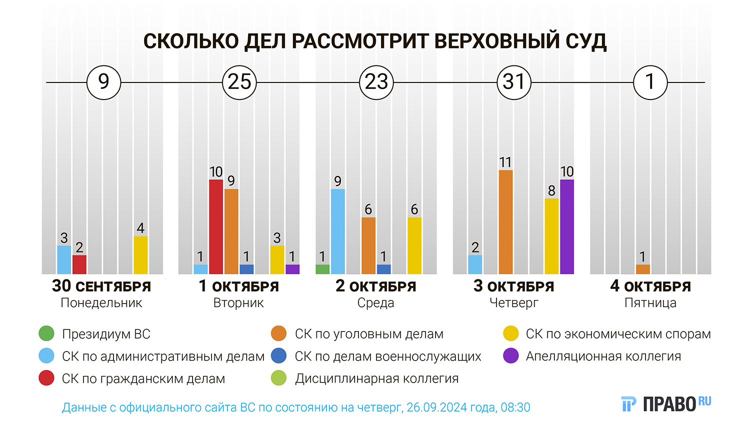 Дисциплинарная коллегия на этой неделе не заседает, а Президиум ВС в среду рассмотрит лишь одну жалобу на приговор по делу об убийстве. Еще два уголовных дела (по террористической 205-й статье УК) разберет коллегия по делам военнослужащих. Наконец, сразу 27 заседаний должно состояться в коллегии ВС по уголовным делам. Среди них выделяется жалоба экс-судьи АСГМ Елены Кондрат на приговор по делу о посредничестве во взяточничестве (№ 5-УД24-76С-А1). В июле Мосгорсуд приговорил Кондрат к девяти годам колонии: следствию удалось доказать, что Кондрат осенью 2020-го передала коллеге Елене Махалкиой, тоже судье АСГМ, $50 000. За эти деньги Махалкина должна была обеспечить нужное решение в рамках банкротного дела.