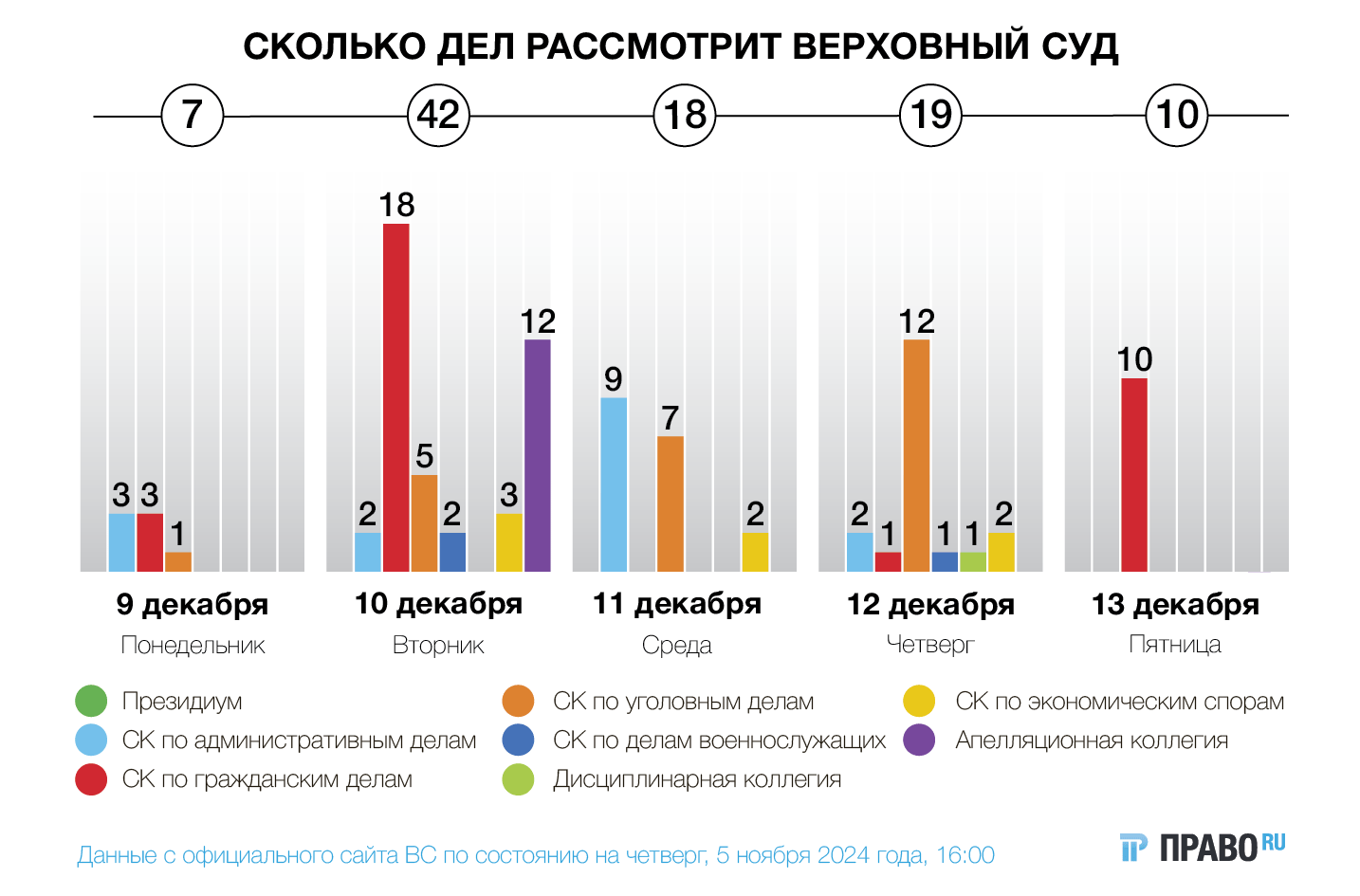 Президиум ВС на этой неделе не собирается. В коллегии по делам военнослужащих запланировано три заседания – все они об участии в террористических организациях. Апелляционная коллегия рассмотрит 13 жалоб, восемь из них заочно.