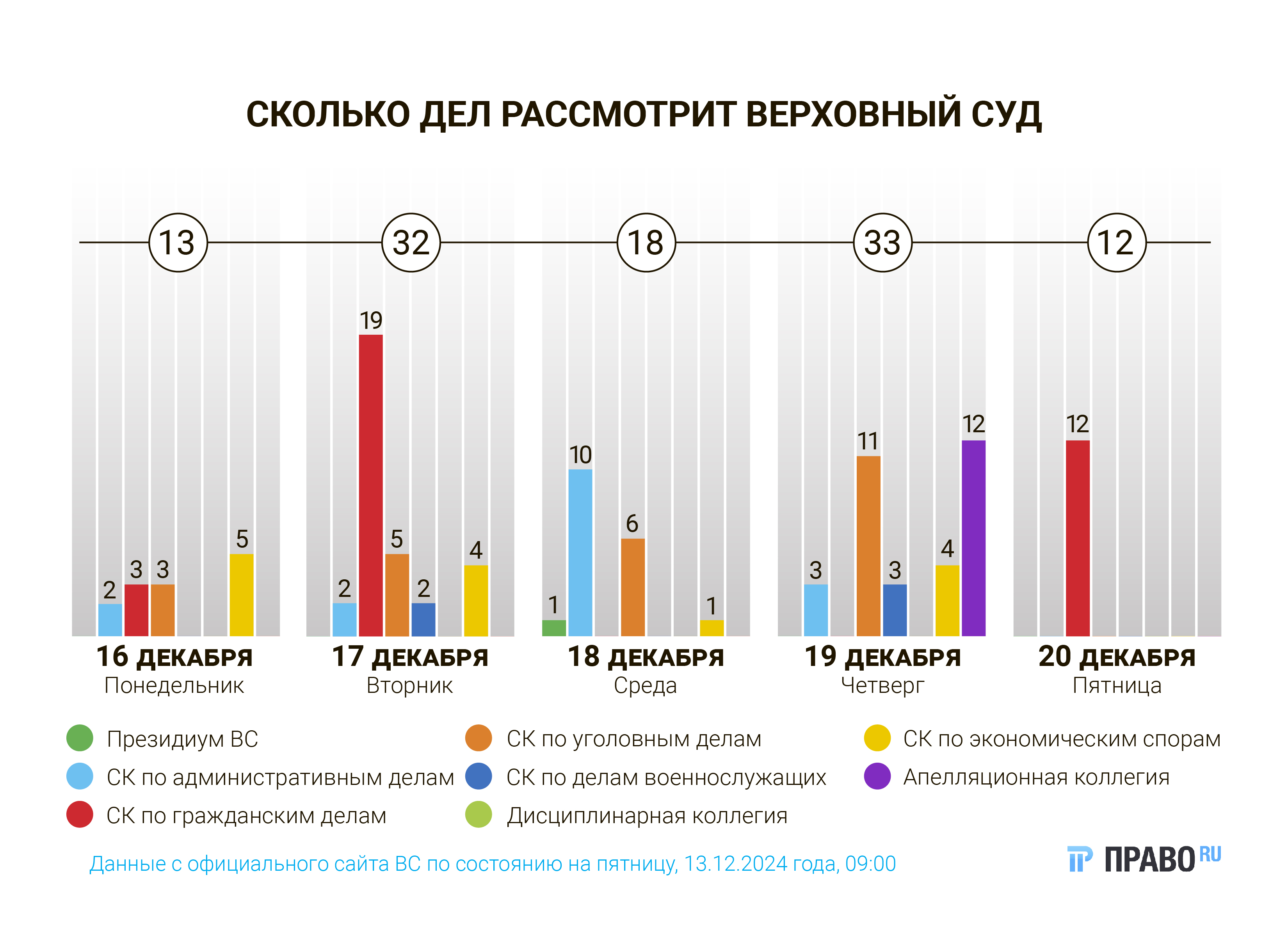 17 споров будет в админколлегии, но все они касаются частных вопросов. В коллегии по делам военнослужащих пять дел, четыре из которых — по террористической ст. 205 УК. В Президиуме ВС всего одно дело, но с учетом того, что год подходит к концу, можно ожидать утверждения нового тематического обзора практики. А дисциплинарная коллегия не будет рассматривать дела на этой неделе.