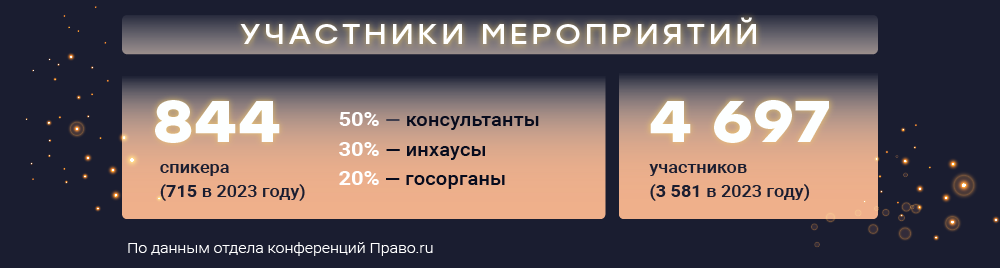 За год в наших мероприятиях поучаствовали 4697 человек. Это почти на четверть больше прошлогоднего результата. 844 человека выступили с докладами на самые разнообразные темы — от глобальных проблем юрбизнеса до прикладных советов о регистрации сделок. Половина спикеров — консультанты ведущих юридических компаний, еще треть — инхаусы, специалисты юрдепартаментов. В 2024 году своими знаниями делились и юристы «Яндекса», Avito, Ozon, Wildberries, фармкомпаний и IT-фирм.