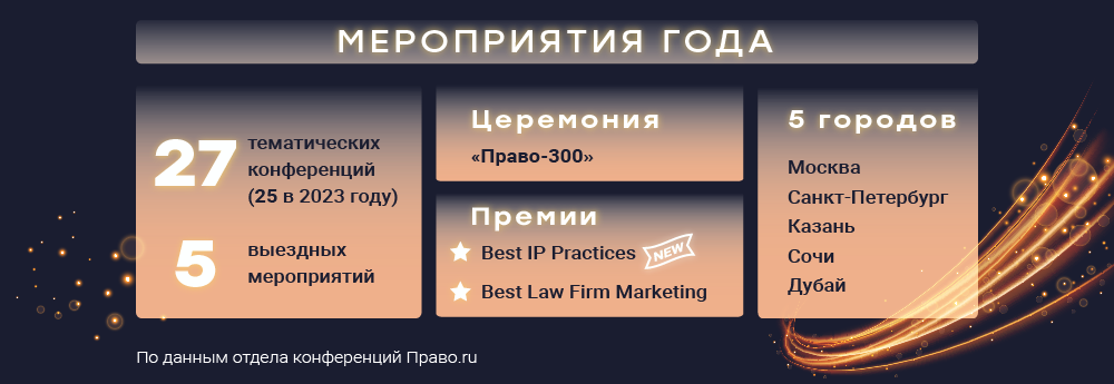 Всего 2024 год запомнится 27 тематическими отраслевыми конференциями и пятью выездными мероприятиями с активной неформальной программой. Помимо традиционной премии в сфере маркетинга Best Law Firm Marketing, Право.ru впервые вручило премию Best IP Practices — ей отметили лучшие IP-проекты инхаус-команд. Кульминацией делового года стала церемония «Право-300». Там объявили победителей ежегодного исследования юррынка.