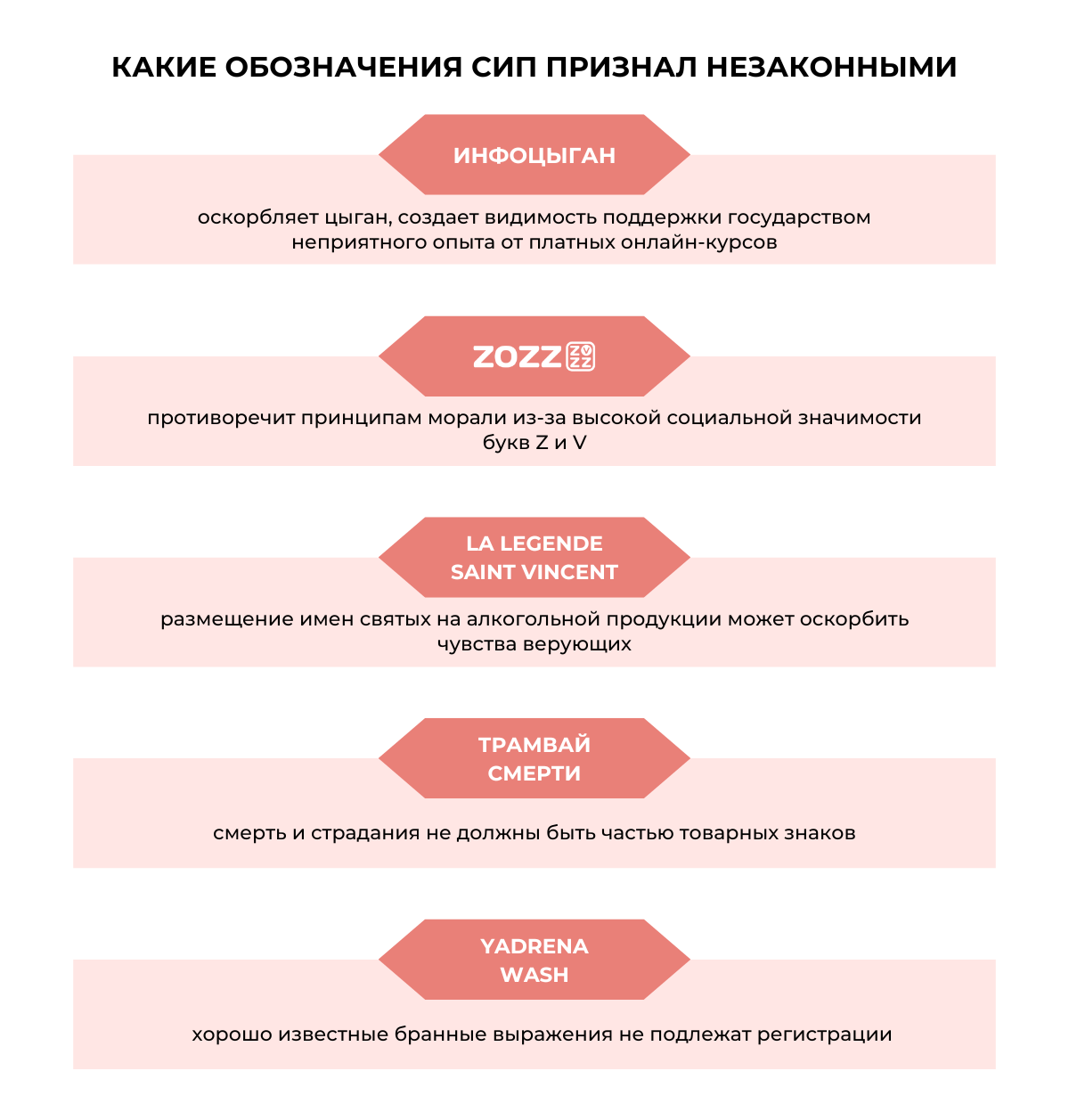Ассоциация специалистов онлайн-образования не смогла зарегистрировать знак «Инфоцыган» (дело № СИП-375/2023). СИП встал на сторону Роспатента и выделил две причины для отказа. Во-первых, слово «инфоцыган» заставит потребителей вспомнить неприятный опыт прохождения платных онлайн-курсов. Во-вторых, обозначение указывает на национальность и может унижать представителей цыганского этноса. «В случае регистрации такого обозначения в сознании потребителей могло возникнуть представление, что такую деятельность поддерживает государство», — поясняет Нефедьев.