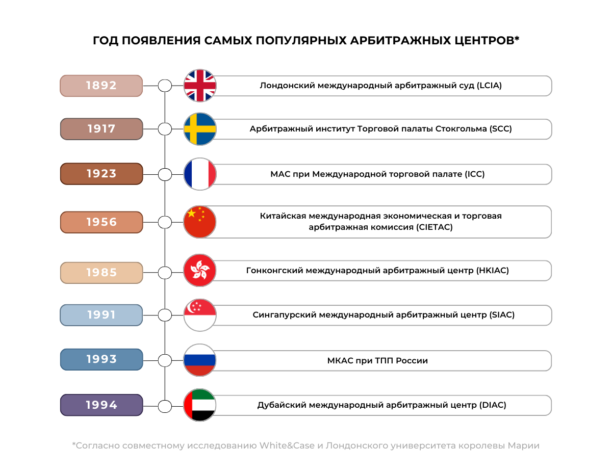 Первые прообразы коммерческого арбитража появились еще в античности. Например, в Древнем Риме был механизм compromissum sub poena. Благодаря ему стороны могли заключить арбитражное соглашение и определить Рим местом рассмотрения спора, а римские суды — взыскать штраф с той стороны, которая не исполнила решение. В Средние века с усложнением хозяйственных связей стал развиваться арбитраж цехов и консулов. Но в современном виде арбитраж появился только в XX веке. Тогда стало очевидно, что средневековых механизмов недостаточно. Кроме этого, исторические формы коммерческого арбитража нельзя назвать международными: государства все равно применяли свои законы и правила судебного процесса, даже если стороны не имели никакого отношения к юрисдикции.