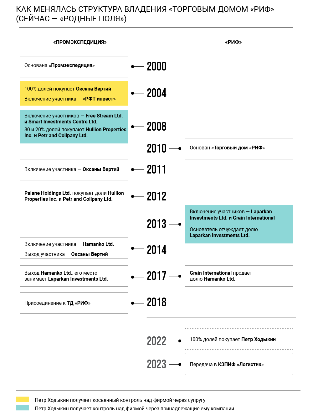 В 2004 году «Промэкспедиция» перешла супруге Ходыкина Оксане Вертий — так предприниматель получил косвенный контроль через режим общей собственности. А в 2008-м бизнесмен получил прямой контроль через принадлежащие ему компании. То же самое произошло с «Торговым домом «РИФ» в 2013 году. В отзыве на иск сказано, что с этого момента Ходыкин не прекращал быть бенефициаром организаций. Передав в 2023-м «Родные поля» в управление КЗПИФ «Логистик», Ходыкин также остался контролирующим бенефициарным владельцем.