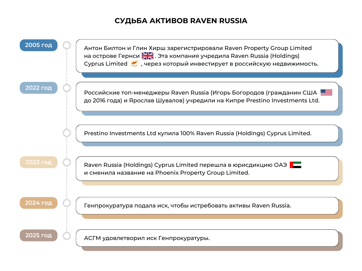 Весной 2022 года структура владения Raven Russia действительно серьезно изменилась. Основанная на острове Гернси и принадлежащая гражданам Великобритании компания Raven Property Group продала свои активы в РФ российскому топ-менеджменту. Контроль над этим имуществом перешел к Игорю Богородову и Ярославу Шувалову через кипрский офшор. Веселов подчеркивает, что его доверители получили все необходимые согласия властей РФ для совершения той сделки, включая одобрение от правительственной комиссии.