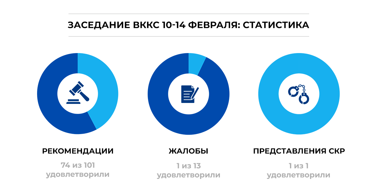 В феврале прошло первое заседание Высшей квалификационной коллегии судей в 2025 году. За пять дней ВККС рассмотрела свыше сотни вопросов, включая рекомендации на руководящие должности в судах, жалобы на региональные ККС и дисциплинарные дела. Среди громких историй — согласие на возбуждение уголовного дела против судьи Назрановского райсуда, которого обвиняют в вынесении неправосудных приговоров в отношении пособников террористов. Подробности — в нашем обзорном материале.