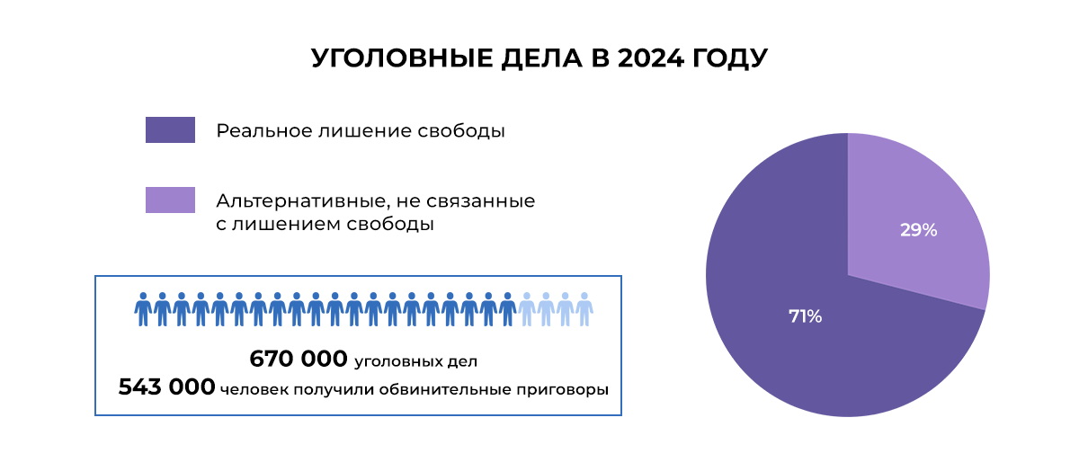 В прошлом году общее количество рассмотренных уголовных дел уменьшилось на 9% по сравнению с 2023 годом. Это связано с сокращением общего количества зарегистрированных преступлений, объяснила Подносова.