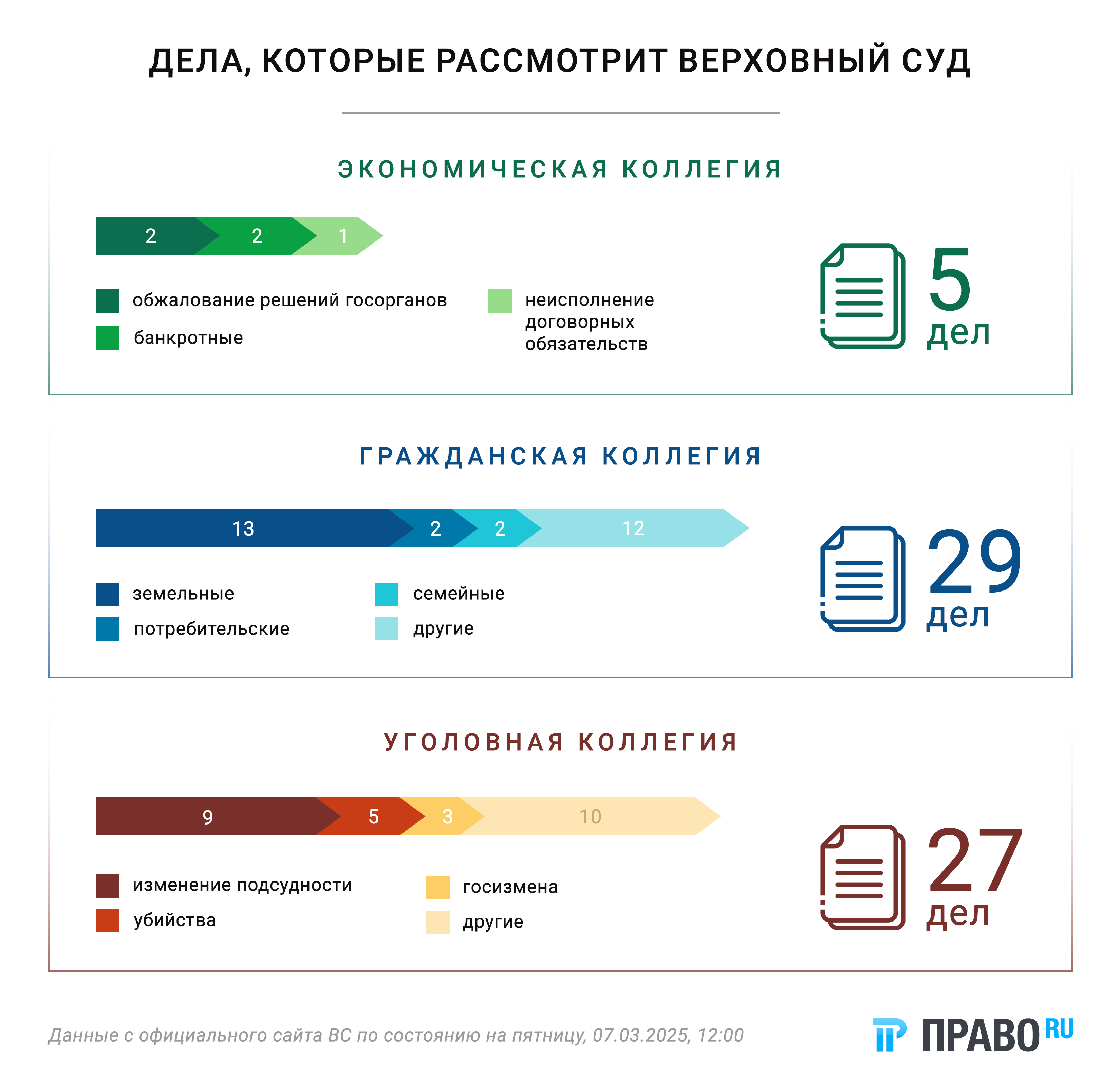 В гражданской коллегии из 29 запланированных дел почти половина — земельные. Из других выделяется разбирательство Анны Воскресиной* с «Газпромбанком», который без предупреждения поднял истцу ставку по кредиту с 4,4 до 24,4% годовых. Банк обосновал свое решение тем, что заемщик расторг договор страхования от несчастных случаев и болезней с «СОГАЗ», хотя его заключение было одним из условий для низкой ставки по кредиту. Три инстанции посчитали, что действия «Газпромбанка» законны, теперь Воскресина попытается доказать обратное в ВС (дело № 3-КГ24-4-К3).