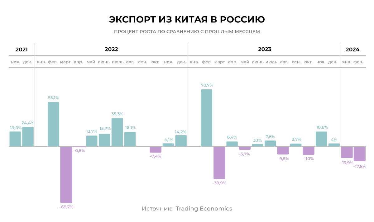 Новое регулирование заметно повлияло на объемы двусторонней торговли между Китаем и Россией: после начала специальной военной операции и после принятия указа № 14114 заметны спады.