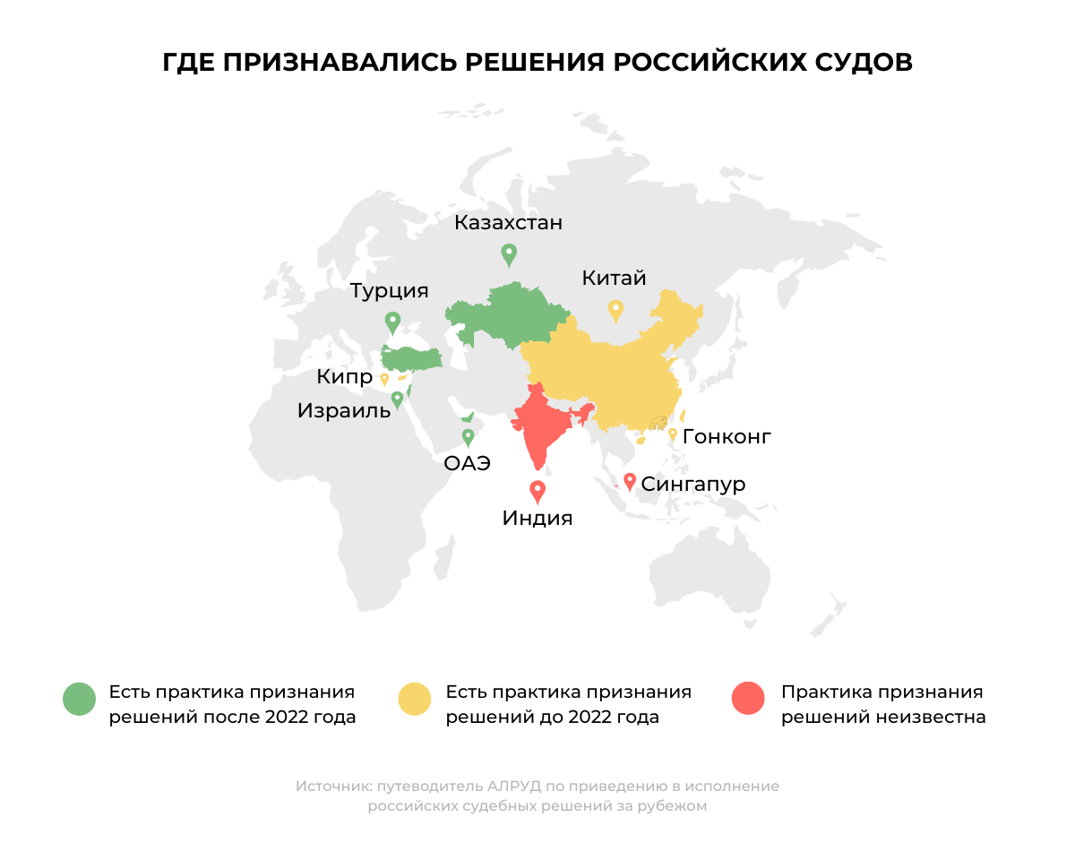 При этом потребность исполнять решения российских судов в других странах у бизнеса остается. Правда, меняются популярные для этого юрисдикции. Например, практика на Кипре заканчивается 2022 годом. Скорее всего, российские компании опасаются, что сейчас там низкая вероятность исполнения, поэтому даже не пытаются этого делать, считает Дмитрий Купцов, партнер практики разрешения споров АЛРУД Одновременно среди отечественного бизнеса растет популярность ОАЭ и Турции: эти юрисдикции выбирают как для разрешения споров, так и для взыскания долгов. Кроме того, российские компании активно развивают сотрудничество с контрагентами из азиатских государств — Китая, Гонконга, Сингапура и Индии.