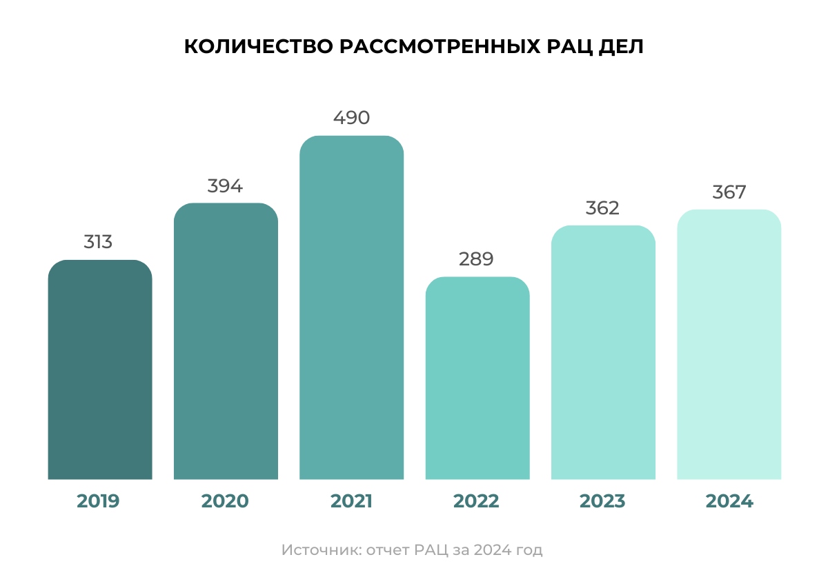 В прошлом году РАЦ вынес 208 арбитражных решений. При этом были случаи прекращения разбирательства: чаще всего от исков отказывались после формирования состава арбитража. Так происходит, когда стороны мирно урегулируют спор. Например, должник понимает, что позиция проигрышная, и выплачивает добровольно долг, объясняет Брановская.
