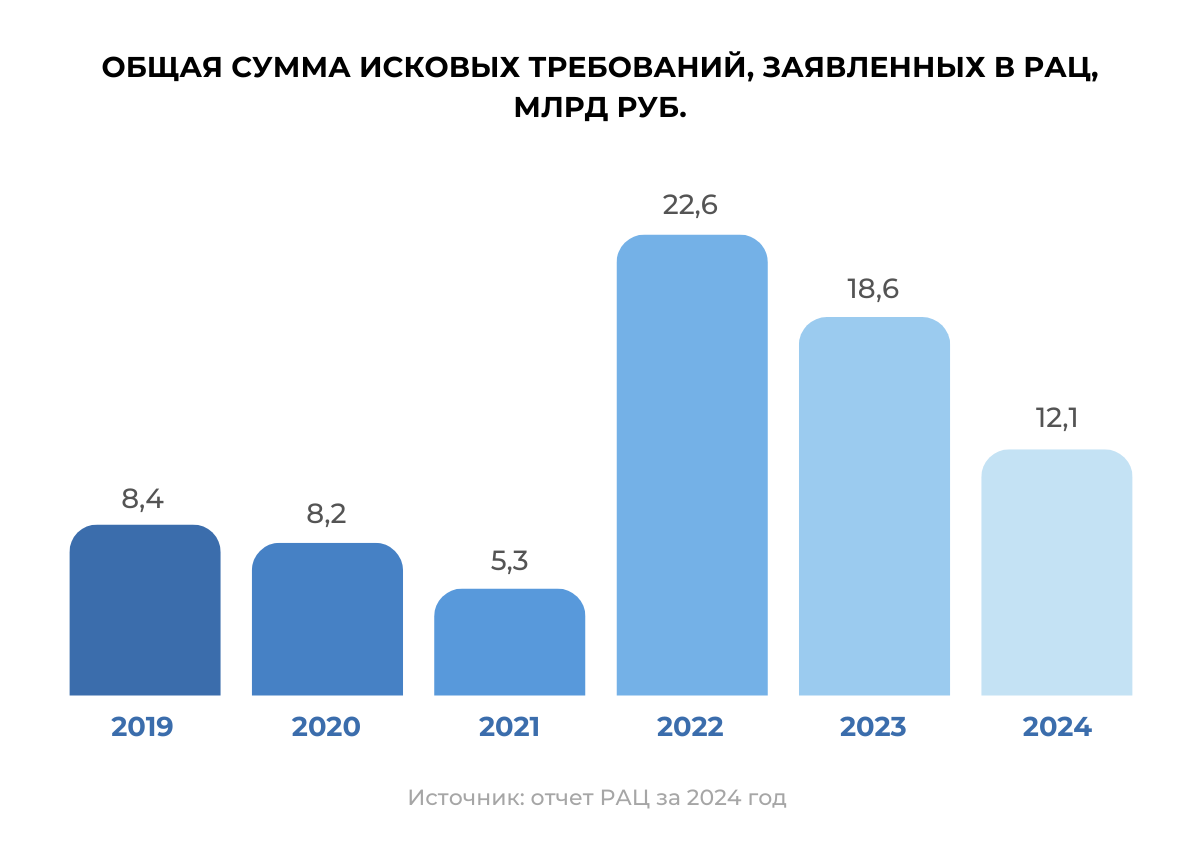 В 2024 году заметно еще снижение общей суммы исковых требований, которые стороны заявляли в РАЦ. Больше всего исков было в диапазоне от 1 до 10 млн руб. (39%), а меньше всего — разбирательств, сумма в которых превышает 100 млн руб. (8%).