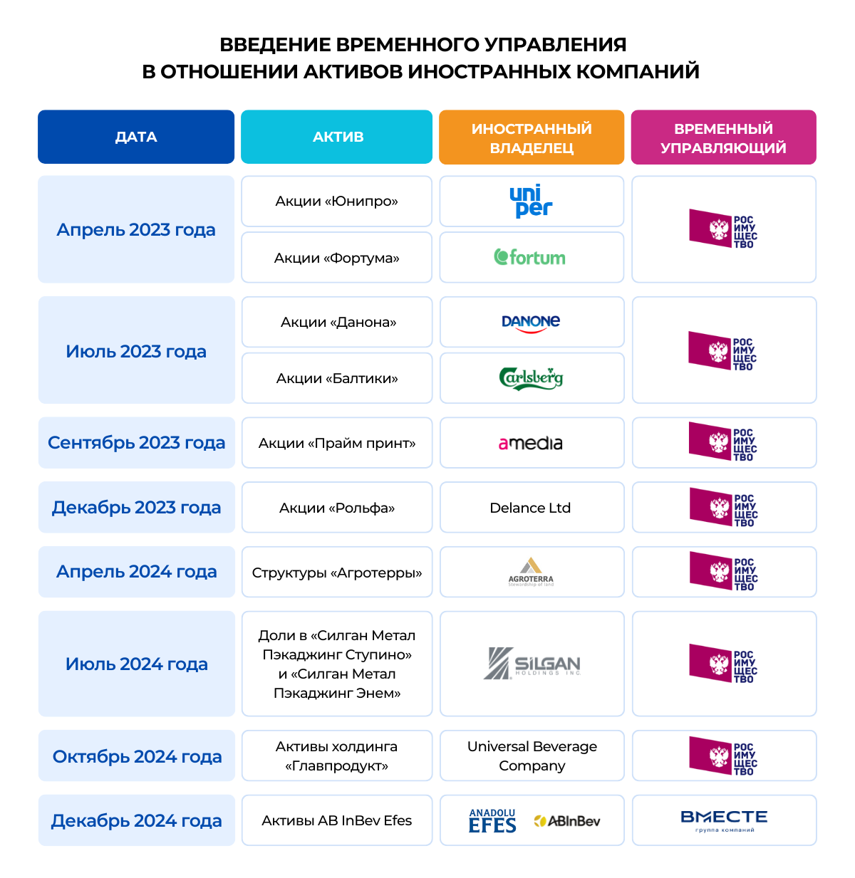 Отмена временного управления до сих пор носила точечный характер, а возращения случались только для дальнейшей продажи имущества отечественным инвесторам. Так, весной 2024 года отменили временное управление в отношении акций «Данона». Это стало первым подобным случаем. Через два месяца Danone продала российские активы отечественной «Вамин Р». Похожая ситуация была и с «Балтикой»: в декабре 2024 года ее акции вывели из-под временного управления и компанию купил «ВГ Инвест». Еще в 2022 году оба предприятия говорили о планах уйти из России.