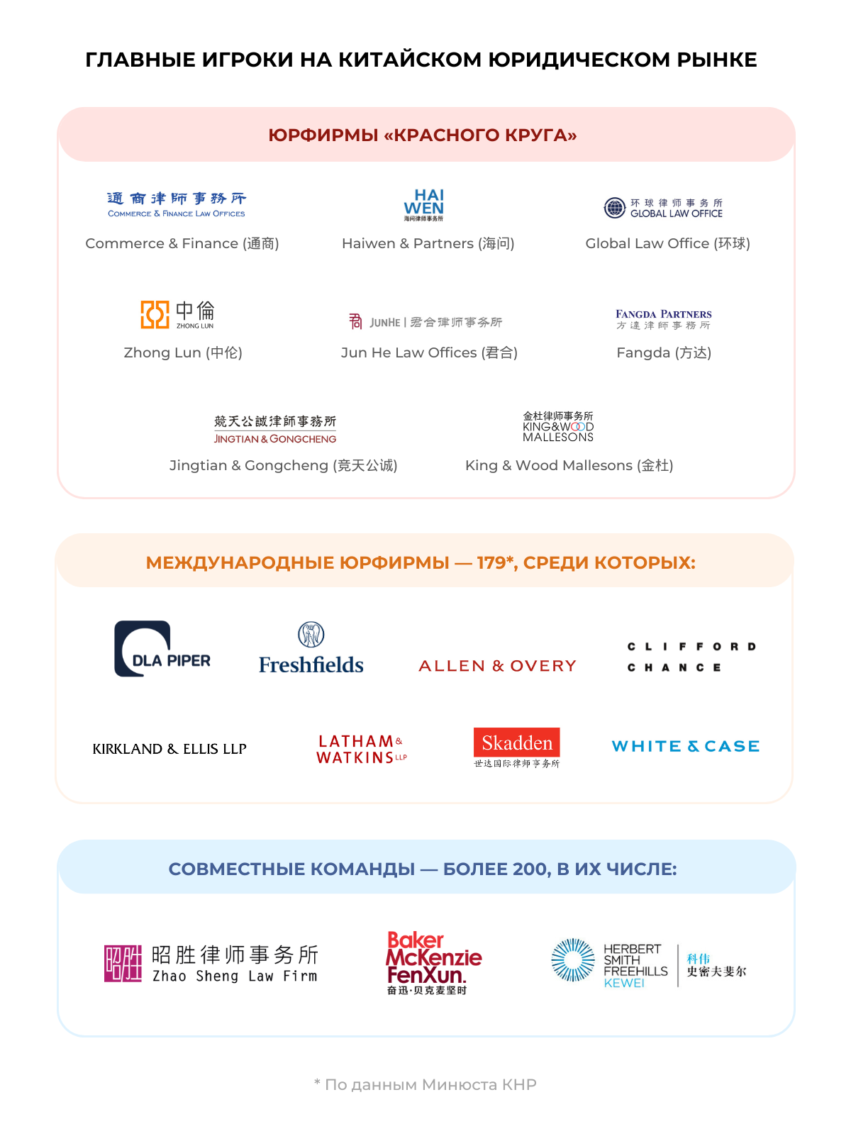 Китайские юрфирмы сейчас успешно конкурируют с западными командами уже и на мировой арене, подчеркивает старший партнер ККМП Алена Кучер. По ее словам, «топовые компании из КНР по уровню экспертных знаний и навыков сопоставимы с ведущими британскими и американскими». Например, входящая в «красный круг» Fangda Partners выиграла тендер на сопровождение сделок M&A для Saudi Arabian Oil Company, обойдя зарубежных коллег.