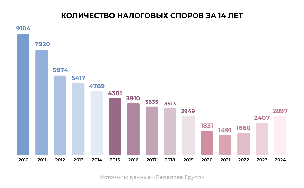 С 2020 по 2022 год эксперт отметил особенное падение числа дел из-за пандемии. Потом их количество начало несколько расти, при этом налоговых споров в 2024-м было меньше, чем в 2019-м. То есть в общем обозначенная тенденция продолжилась.