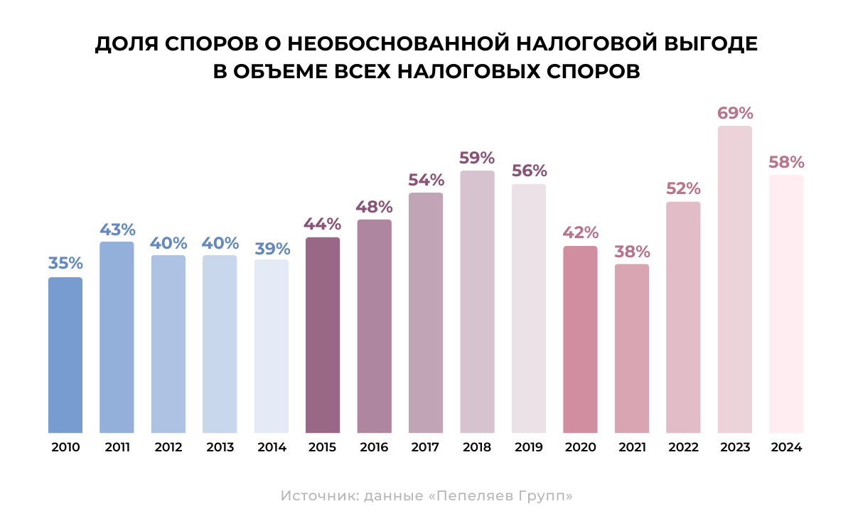 Сейчас налоговая все больше делает акцент на необоснованной налоговой выгоде (ст. 54.1 НК). При этом количество споров о применении норм Налогового кодекса об НДС и налоге на прибыль постоянно сокращается: в 2024 году доля таких споров составила 3 и 4% соответственно.