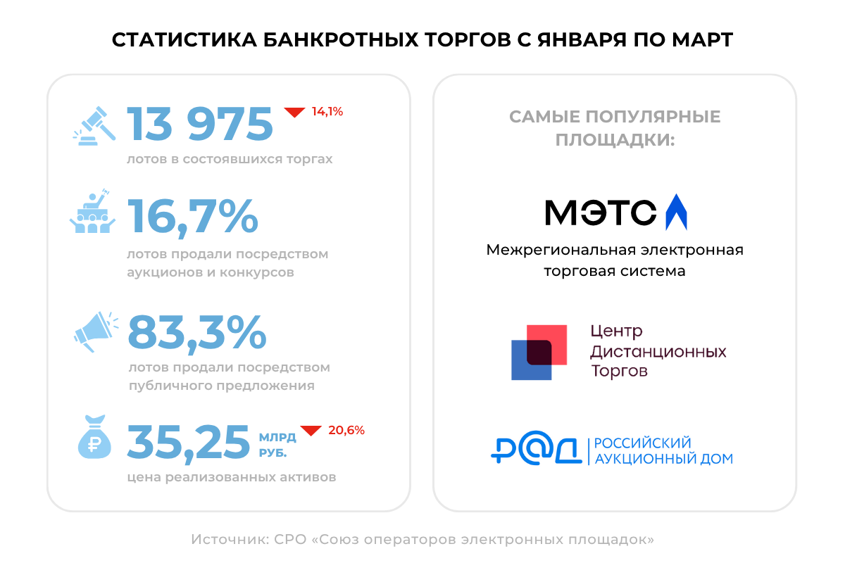 Союз операторов электронных площадок проанализировал результаты торгов в банкротстве за первый квартал года. Полученные данные опубликовали на Федресурсе. По сравнению с первыми тремя месяцами прошлого года активность на торгах снизилась: лотов в состоявшихся торгах стало меньше, а стоимость реализованного имущества — ниже.