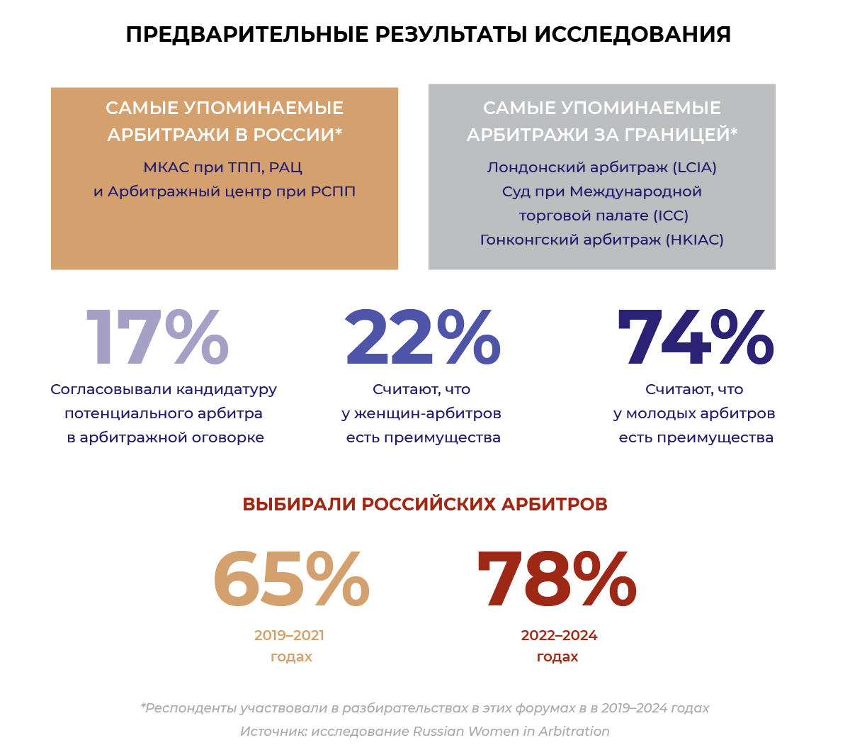 Команда Russian Women in Arbitration (RWA) провела исследование, чтобы определить подходы к выбору и назначению арбитров в спорах, связанных с Россией, за период с 2019 по 2024 год. На совместном мероприятии RWA и Адвокатского бюро «Иванян и Партнеры», проходившем в рамках RIAC-2025, представили предварительные результаты исследования, которые получили на основании опроса российских юрфирм. В финальном отчете, который выйдет позднее, RWA опубликуют аналитику по внутренним и международным разбирательствам и статистику, подготовленную российскими и иностранными арбитражными центрами.