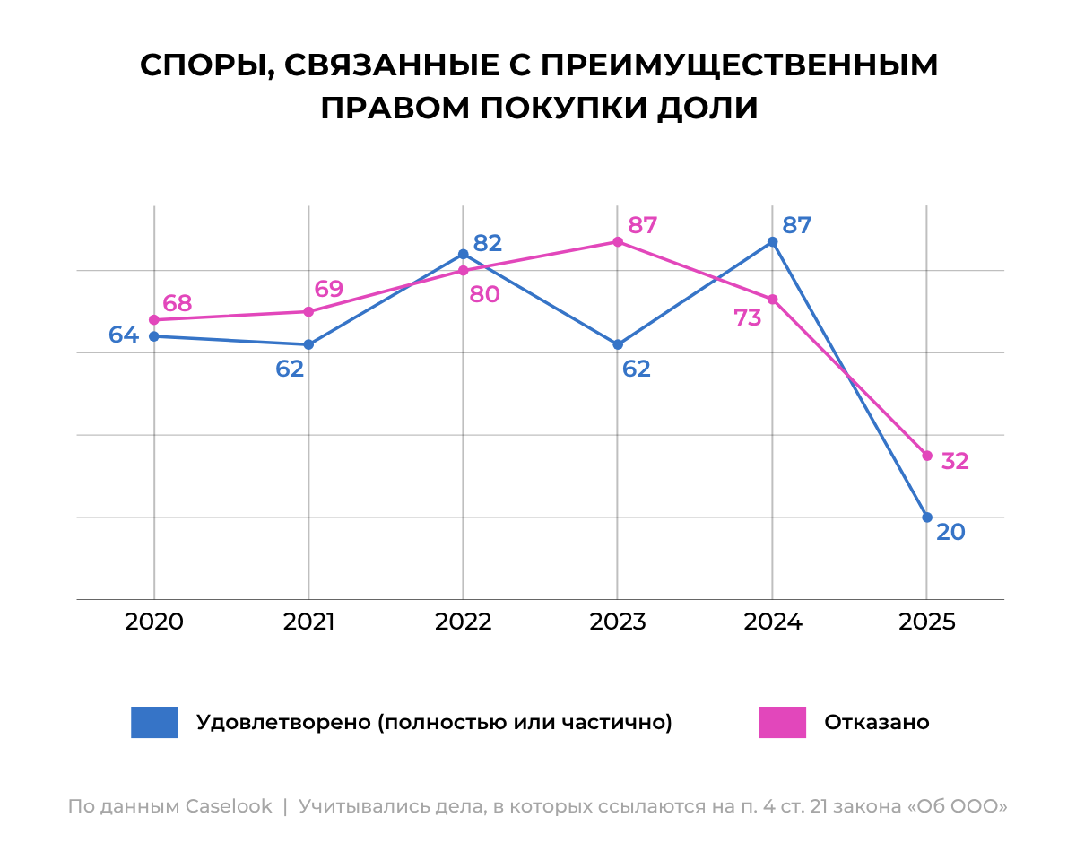 Типовые споры — оспаривание продажи доли третьему лицу в обход механизма, требование перевода прав и обязанностей покупателя на участника, который не смог воспользоваться правом преимущественной покупки, определение размера приобретаемой доли. В целом практика последовательна, хоть и крайне чувствительна к деталям каждого дела, говорит Лукьянова. Но есть особо значимые кейсы.
