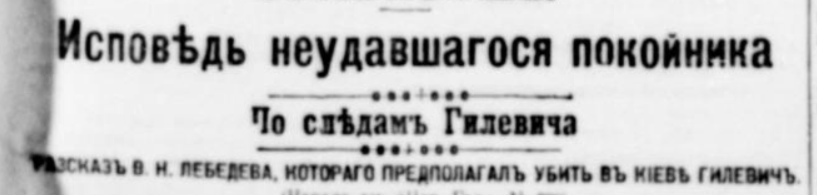 Версии о личности убитого постоянно менялись. Сначала жертвой считали студента Баркова, но тот нашелся за границей. Потом думали, что убит Андреев, который писал матери, что собирается путешествовать с неким инженером, и тоже исчез. Журналисты подливали масла в огонь, каждый день печатая новые предположения. Много шума наделала опубликованная в прессе «исповедь неудавшегося покойника». Некто Лебедев рассказывал, что в сентябре он увидел газетное объявление: «Нужен в отъезд интеллигентный, холостой, на очень хорошее жалованье». Вскоре он познакомился с публикатором. Тот представился Степаном Федоровым и сообщил, что ищет секретаря «для одного богатого господина». Беседовали недолго: Федоров лишь внимательно рассмотрел паспорт кандидата на должность и поинтересовался, не состоит ли тот на учете в полиции. Потом он сообщил, что Лебедев подходит, но его «патрон» живет в Берлине и нужно сделать заграничный паспорт. Когда документы были готовы, Федоров предложил сначала заехать в Киев.