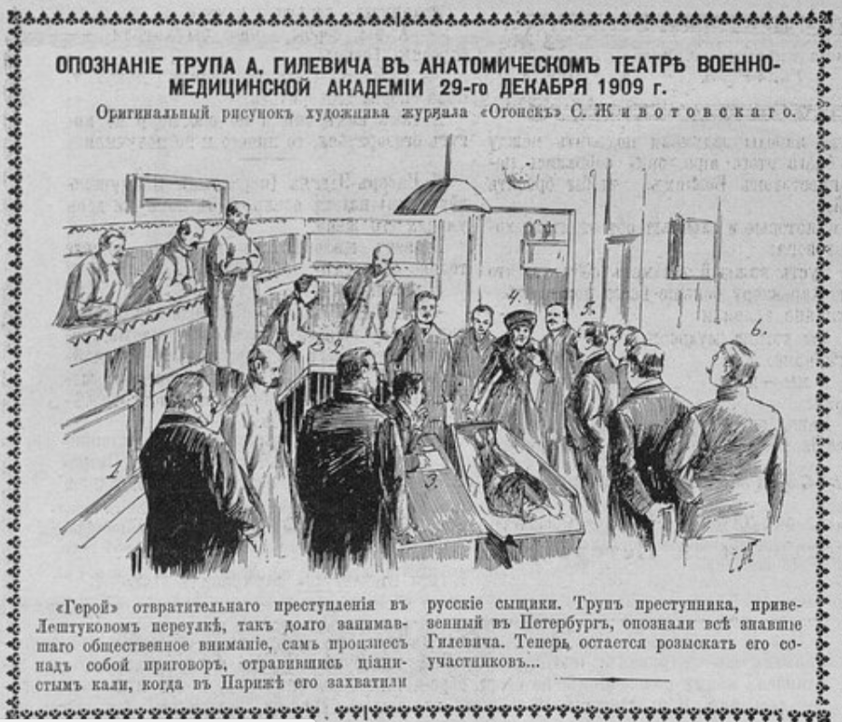 ОПОЗНАНИЕ ТРУПА ГИЛЕВИЧА. «ОГОНЕК». 1910. № 2