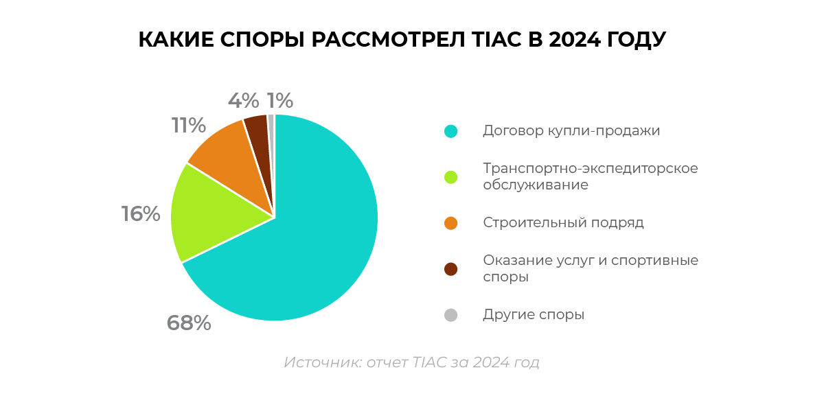 За прошлый год TIAC вынес 31 решение, а споры в среднем длились восемь месяцев. Согласно статистике центра, больше всего разбирательств вытекает из договоров купли-продажи. Дальше идут дела из соглашений на транспортно-экспедиторское обслуживание и строительный подряд. Кроме этого, центр рассматривает споры из контрактов на оказание услуг и ведет спортивные разбирательства.